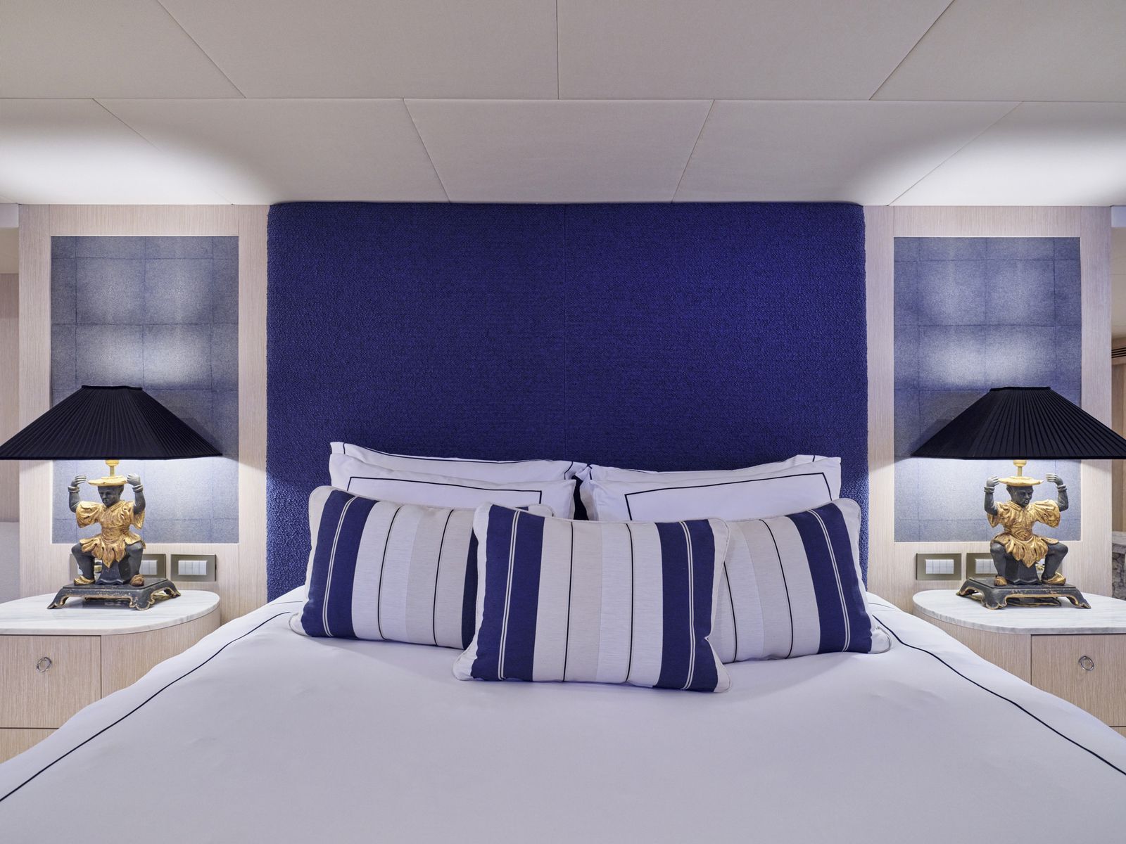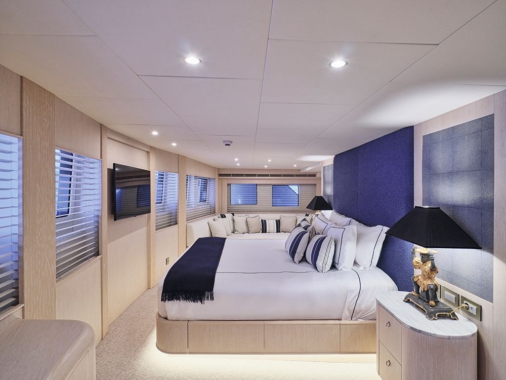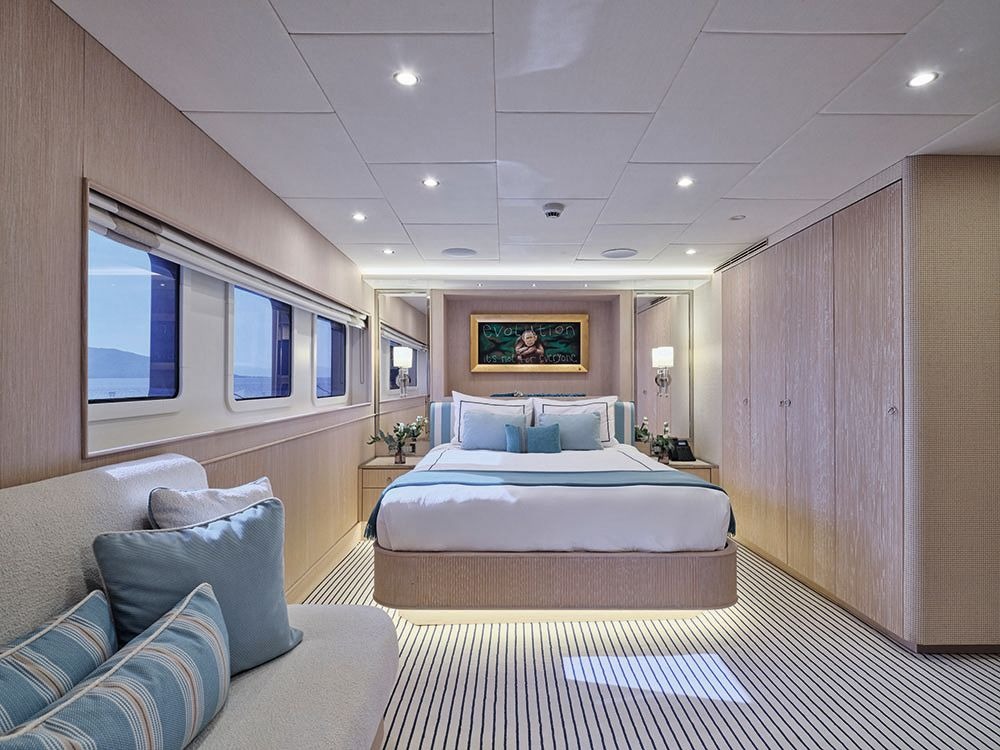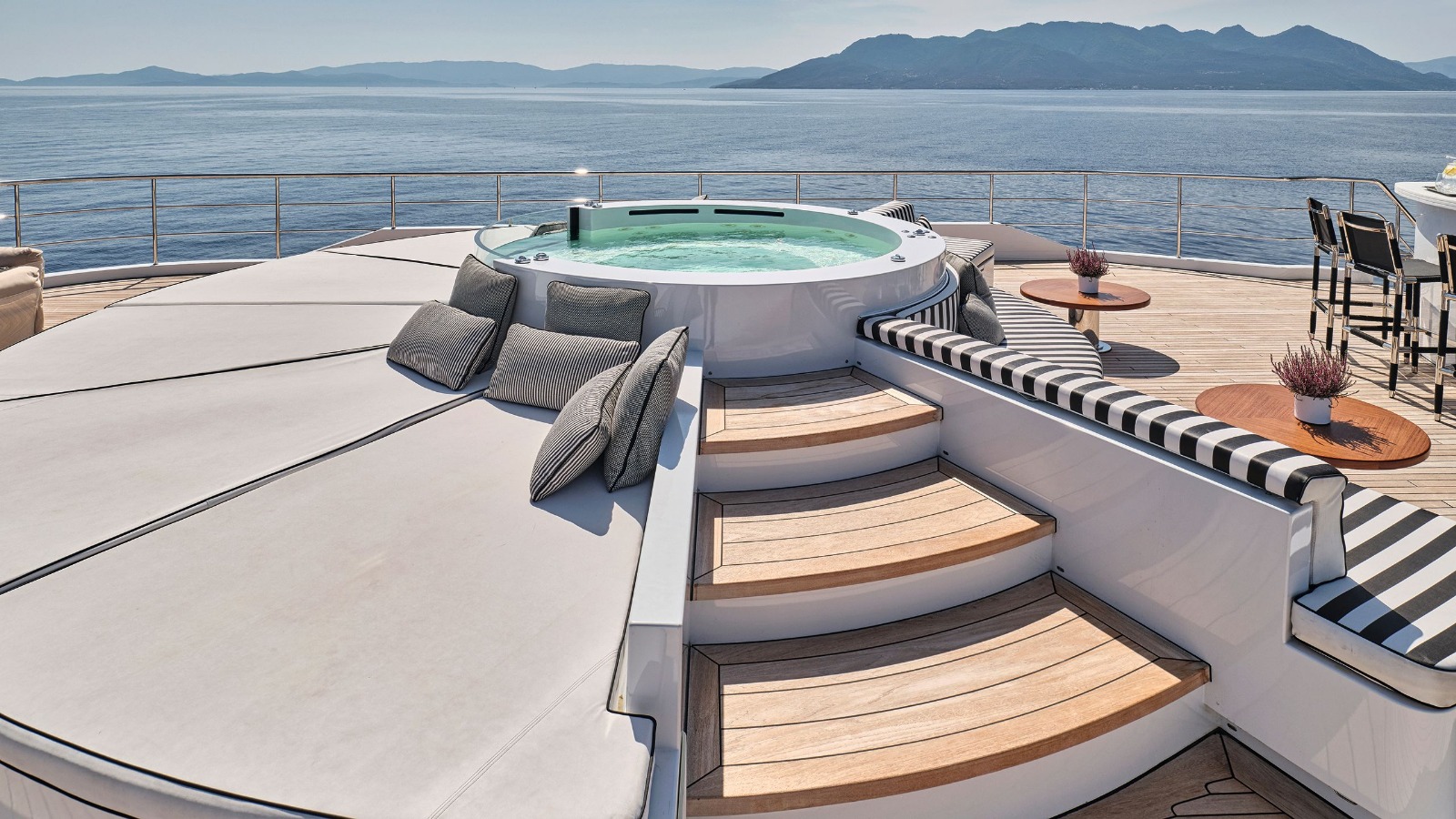 Onboard, she accommodates up to 16 guests in absolute comfort, offering a suite of luxurious amenities including a whirlpool-equipped sun deck, multiple al fresco dining and lounge areas, and tastefully reimagined interiors. High ceilings, warm natural tones, and curated design elements create an inviting, modern atmosphere that feels both refined and relaxed.
