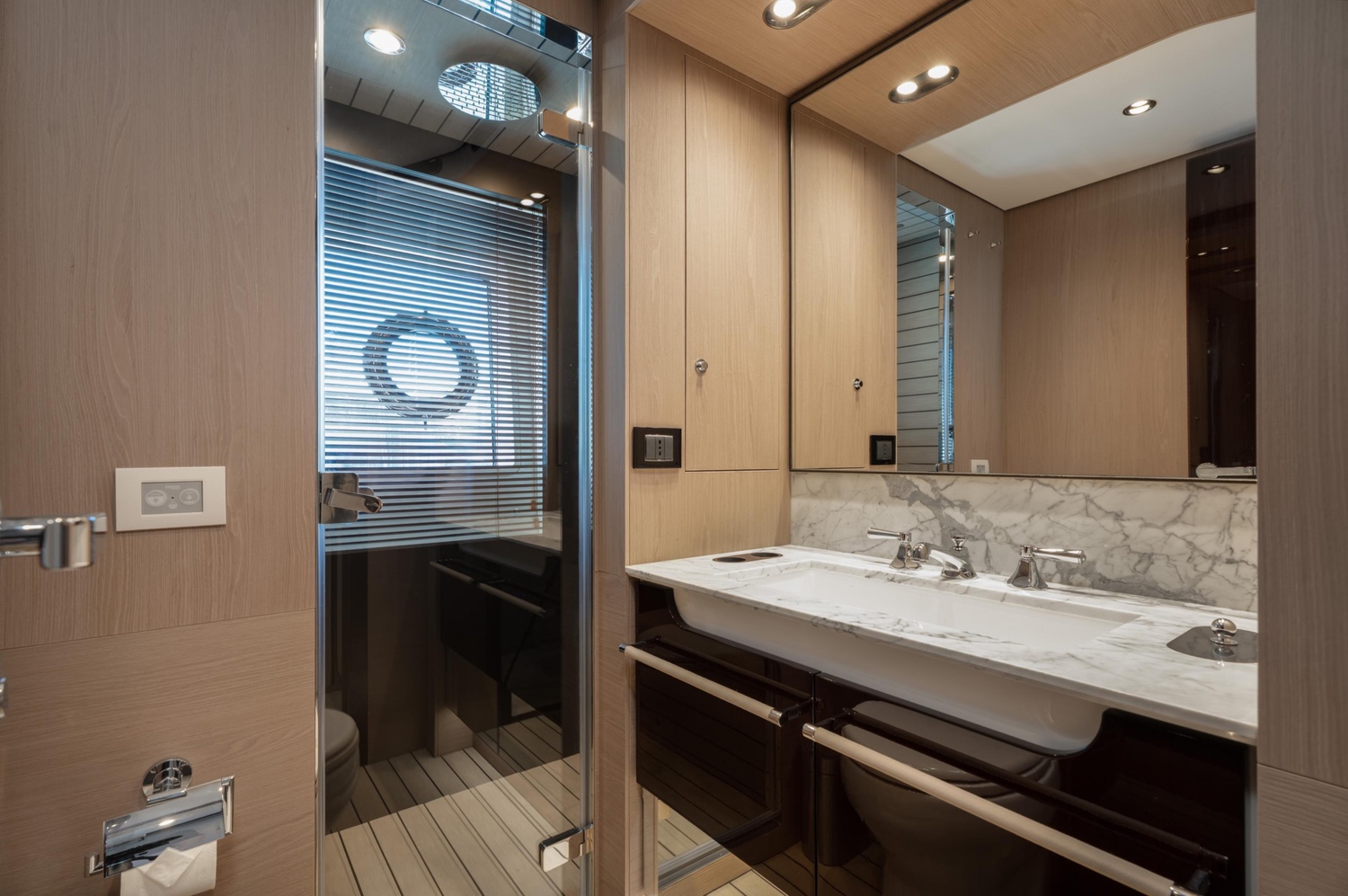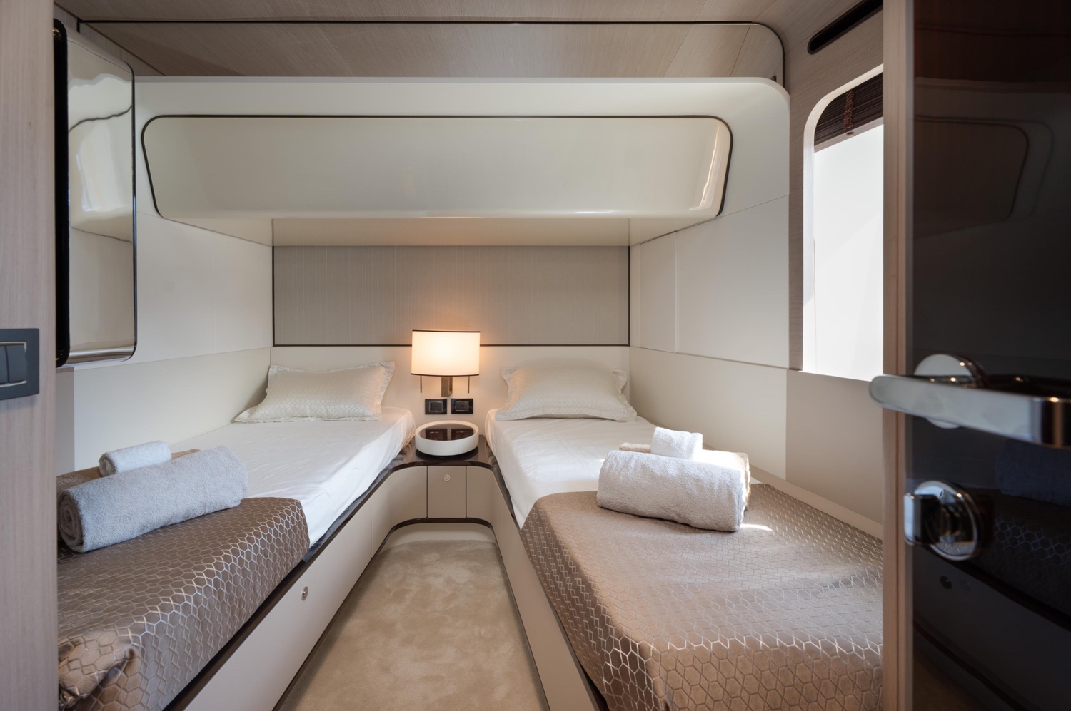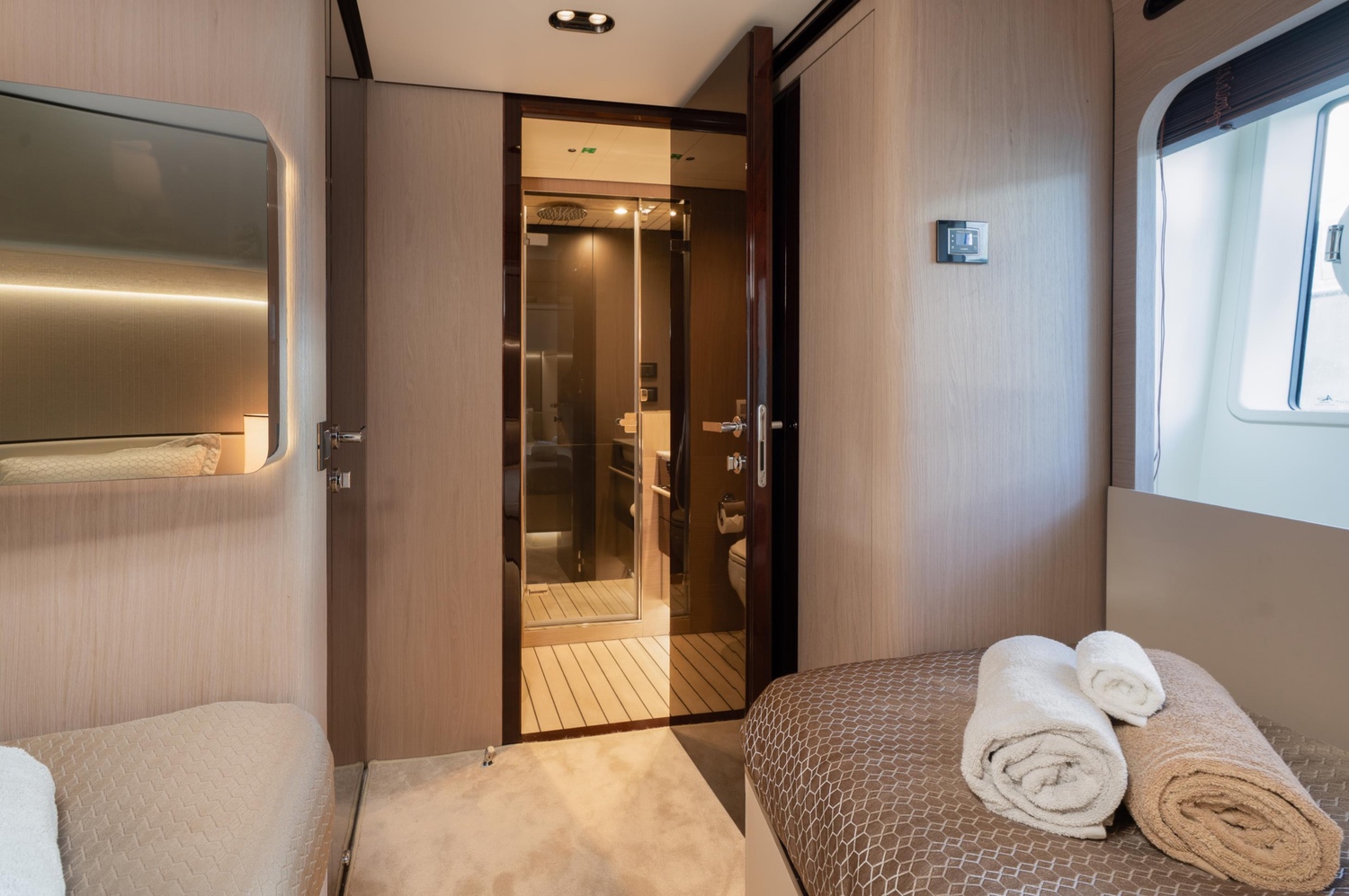 One of the most notable attributes of Azimut Grande 27 is her thoughtfully designed layout. The yacht features a full-beam Owner’s suite strategically positioned forward on the main deck, providing maximum privacy and uninterrupted panoramic views. Complementing this are four well-appointed guest staterooms located on the lower deck, offering versatile accommodation for up to ten guests in complete comfort.