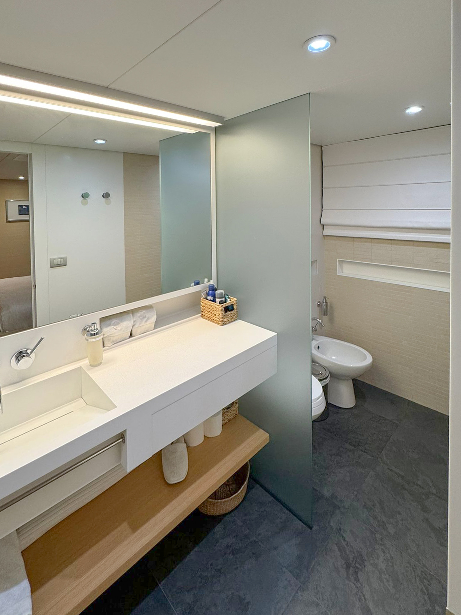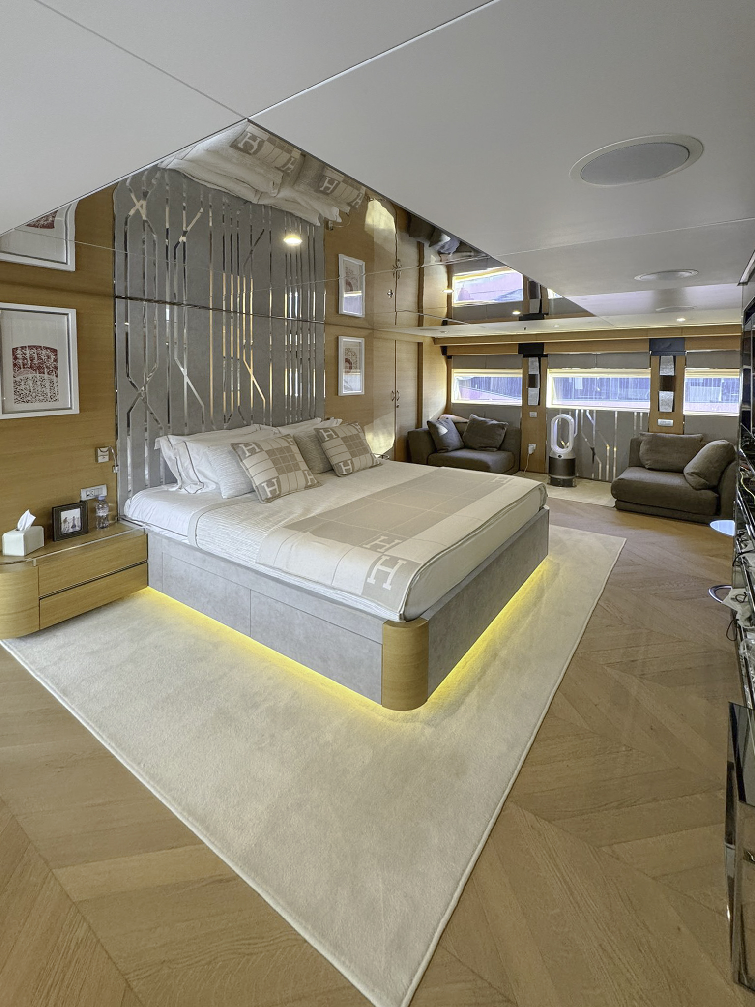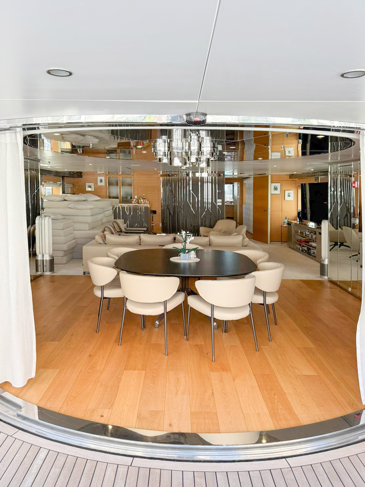 Exterior designed by Giorgio Vafiadis is stylish and recognizable, with pure lines and elegancy. You will get a strong feeling of being onboard of much bigger yacht. Luxury yet laconic interior was created by Askdeco and recently renewed and upgraded by the present Owner. The size of the vessel allowed architects to create a spacious interior like in a magnificent modern style country house. Extensive glazing of public spaces adds a large amount of daylight. The use of mirrored ceiling panels makes interior even more individual and expands the onboard space.