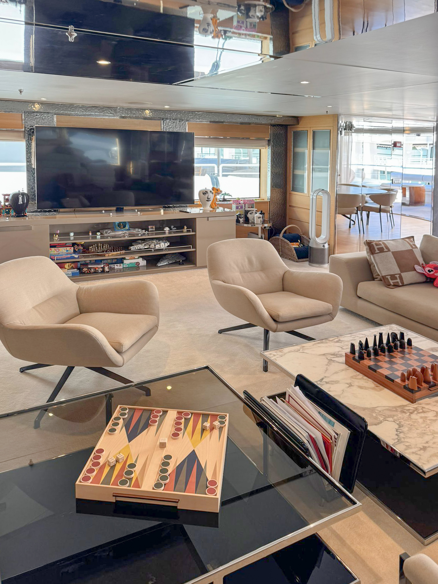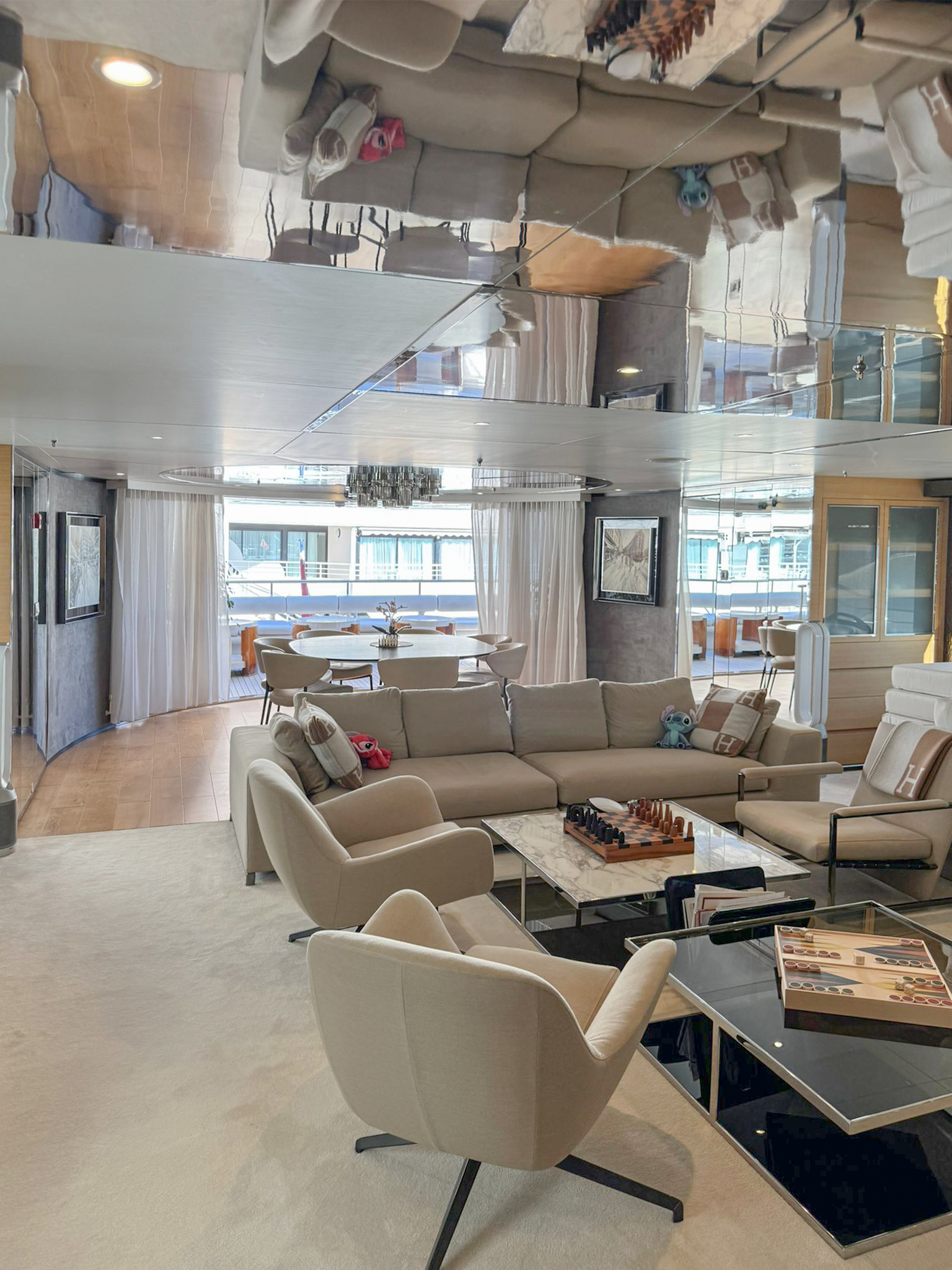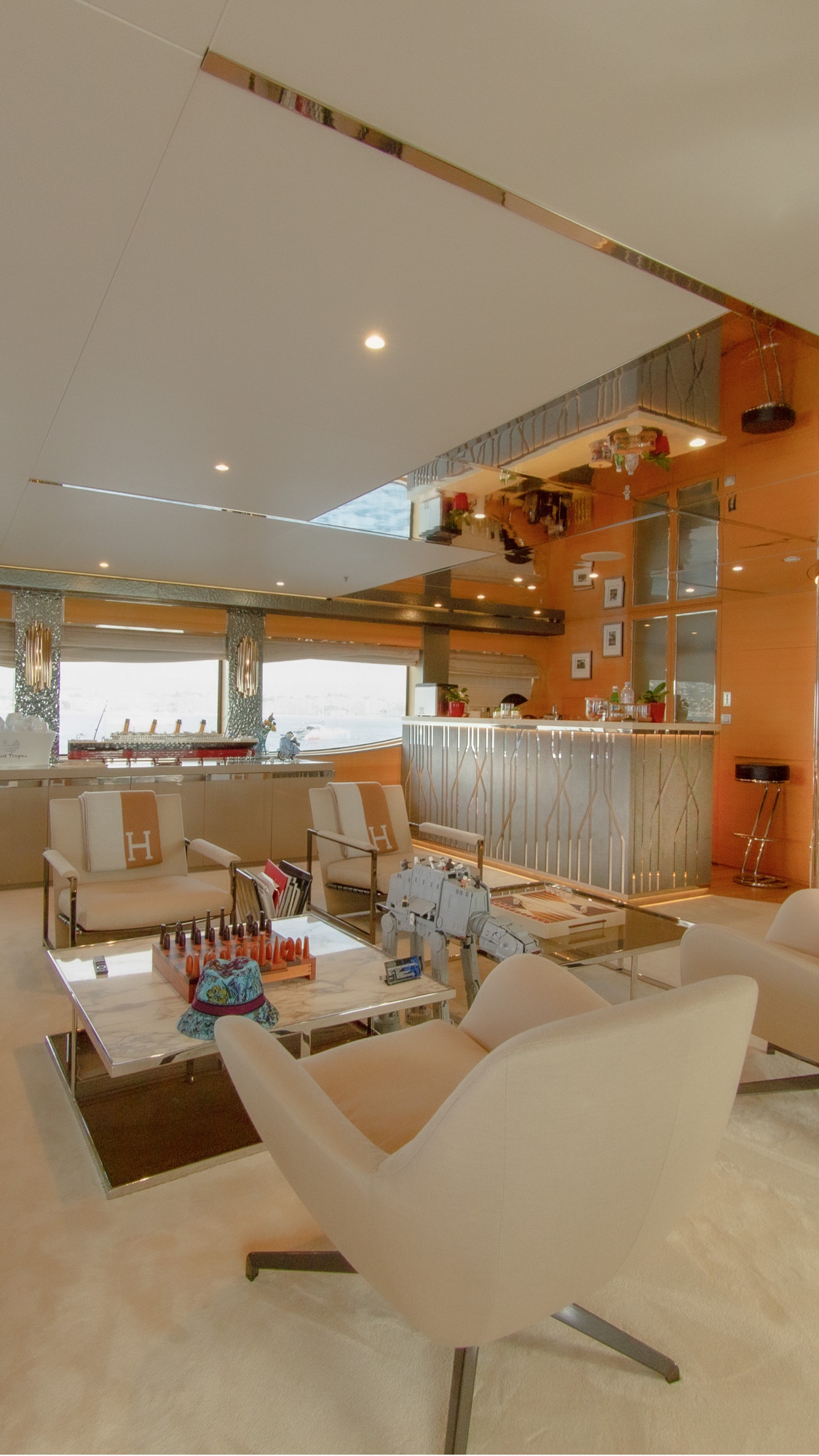 Exterior designed by Giorgio Vafiadis is stylish and recognizable, with pure lines and elegancy. You will get a strong feeling of being onboard of much bigger yacht. Luxury yet laconic interior was created by Askdeco and recently renewed and upgraded by the present Owner. The size of the vessel allowed architects to create a spacious interior like in a magnificent modern style country house. Extensive glazing of public spaces adds a large amount of daylight. The use of mirrored ceiling panels makes interior even more individual and expands the onboard space.