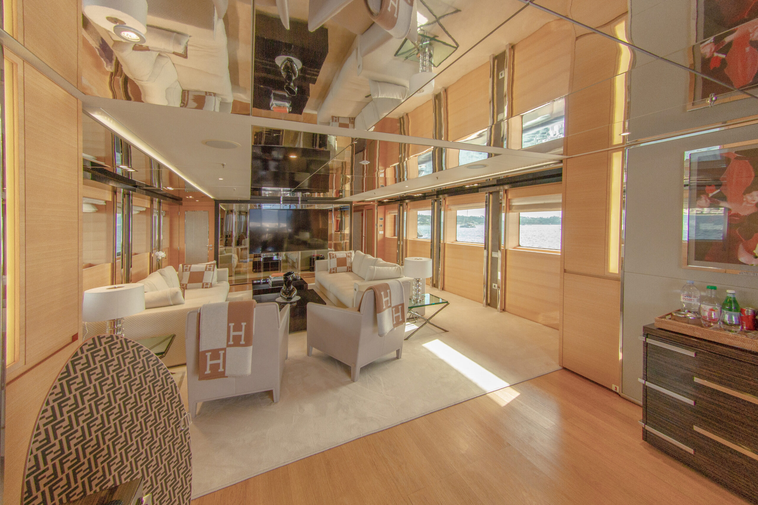 Exterior designed by Giorgio Vafiadis is stylish and recognizable, with pure lines and elegancy. You will get a strong feeling of being onboard of much bigger yacht. Luxury yet laconic interior was created by Askdeco and recently renewed and upgraded by the present Owner. The size of the vessel allowed architects to create a spacious interior like in a magnificent modern style country house. Extensive glazing of public spaces adds a large amount of daylight. The use of mirrored ceiling panels makes interior even more individual and expands the onboard space.