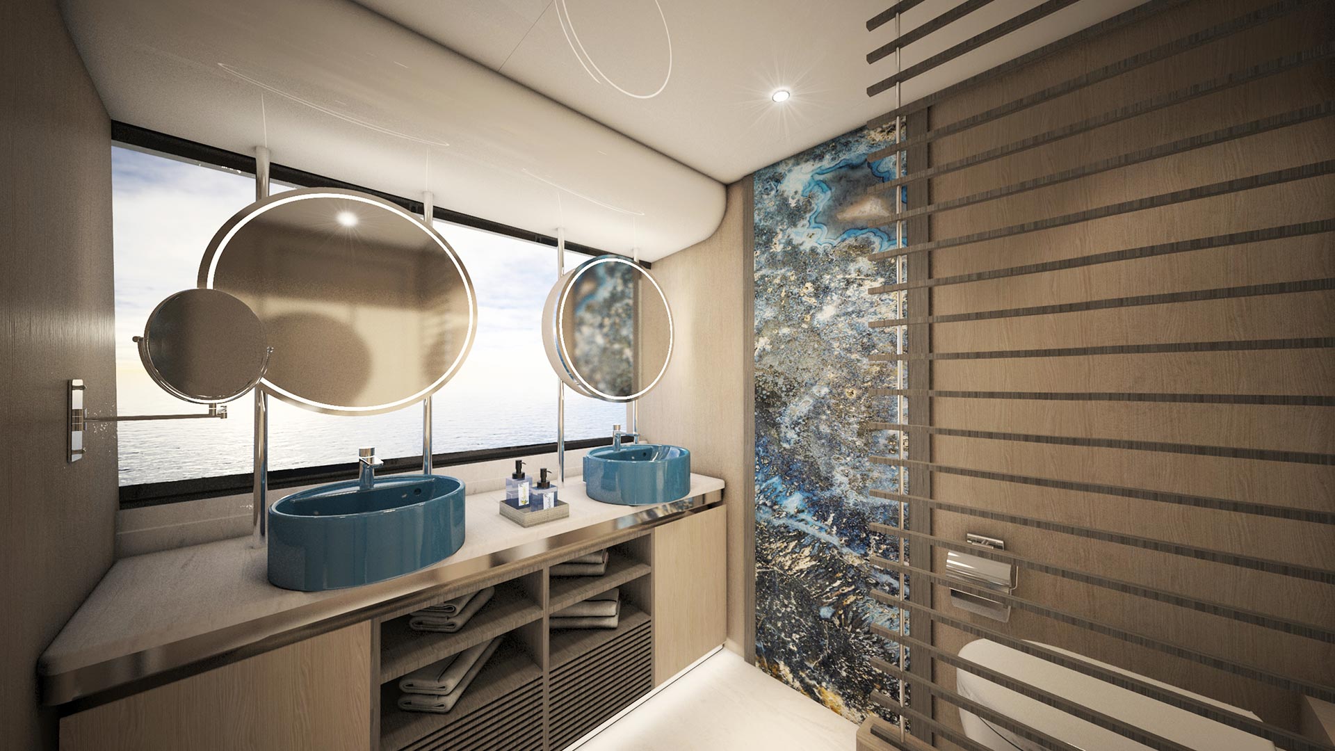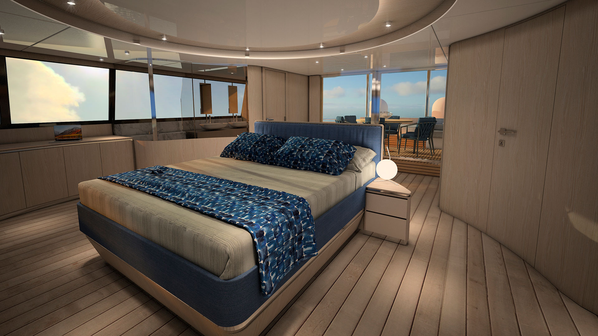 The closed 3-deck version features an owner’s suite with a private 41 m² aft terrace. Those who value sharing their experiences on board can opt for an indoor lounge instead. It is comprised of a 39 m² dining area, fully equipped with a bar and galley, while still maintaining the same terrace in the aft.