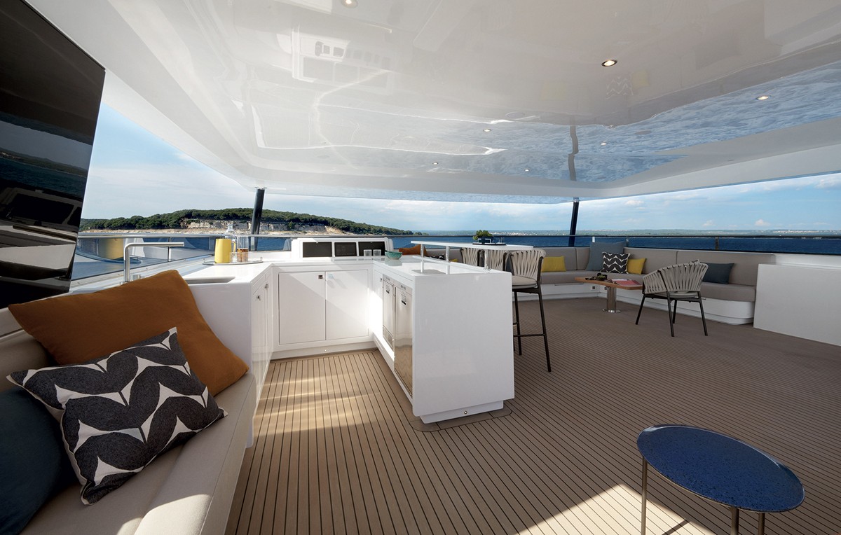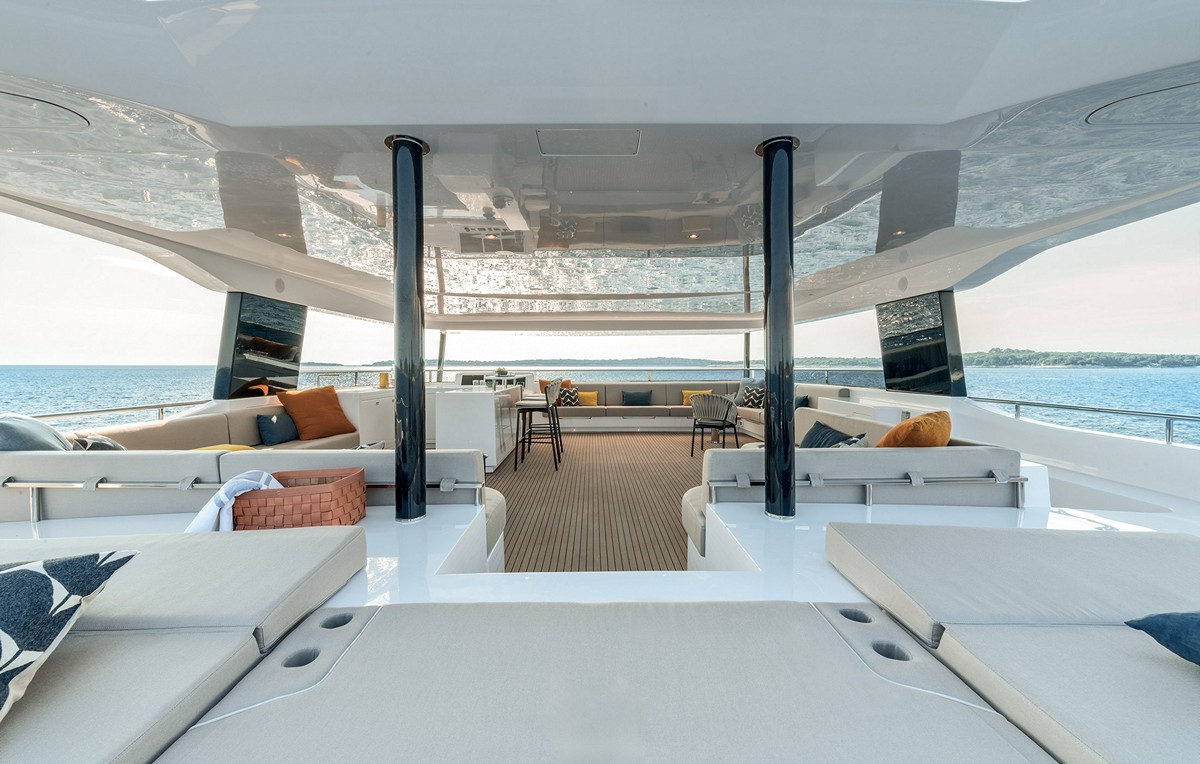 An additional open deck combines the benefits of larger catamarans with the compact dimensions of the 60 Series. The flybridge is a fantastic outdoor community space, equipped with a full dining area, offering panoramic views and a superyacht atmosphere.