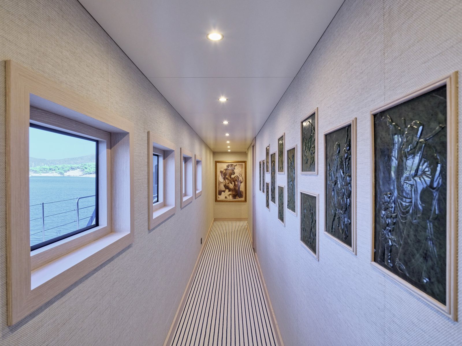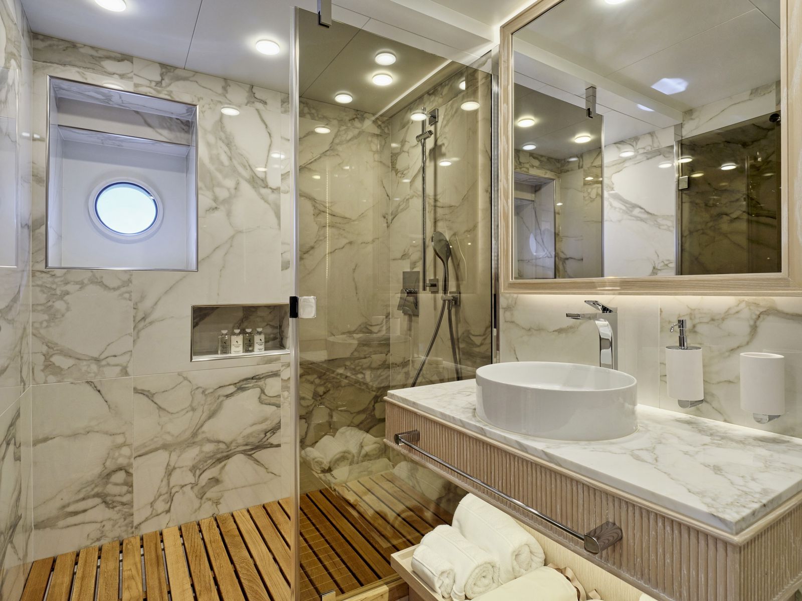 Onboard, she accommodates up to 16 guests in absolute comfort, offering a suite of luxurious amenities including a whirlpool-equipped sun deck, multiple al fresco dining and lounge areas, and tastefully reimagined interiors. High ceilings, warm natural tones, and curated design elements create an inviting, modern atmosphere that feels both refined and relaxed.