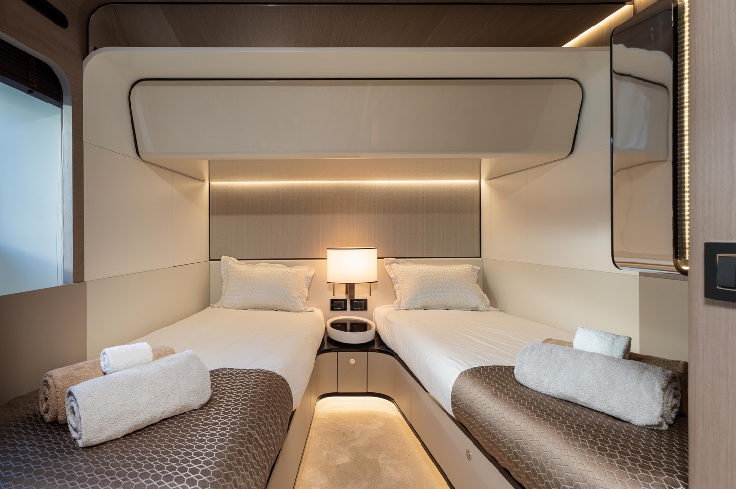 One of the most notable attributes of Azimut Grande 27 is her thoughtfully designed layout. The yacht features a full-beam Owner’s suite strategically positioned forward on the main deck, providing maximum privacy and uninterrupted panoramic views. Complementing this are four well-appointed guest staterooms located on the lower deck, offering versatile accommodation for up to ten guests in complete comfort.