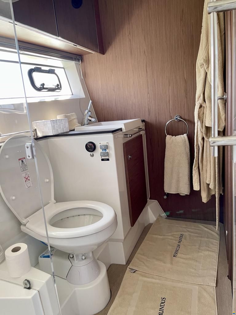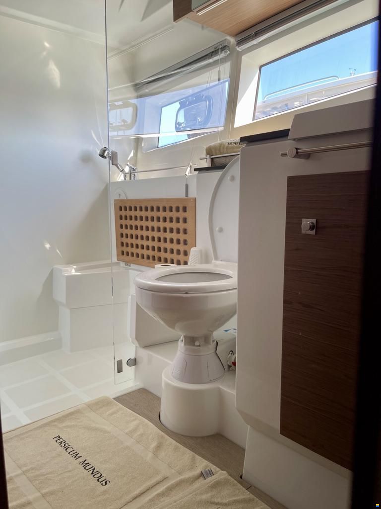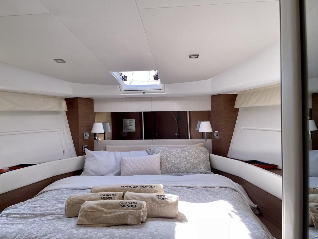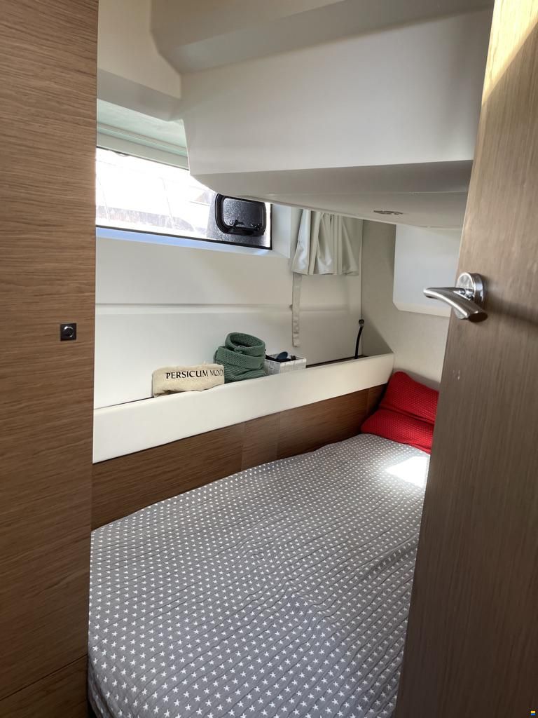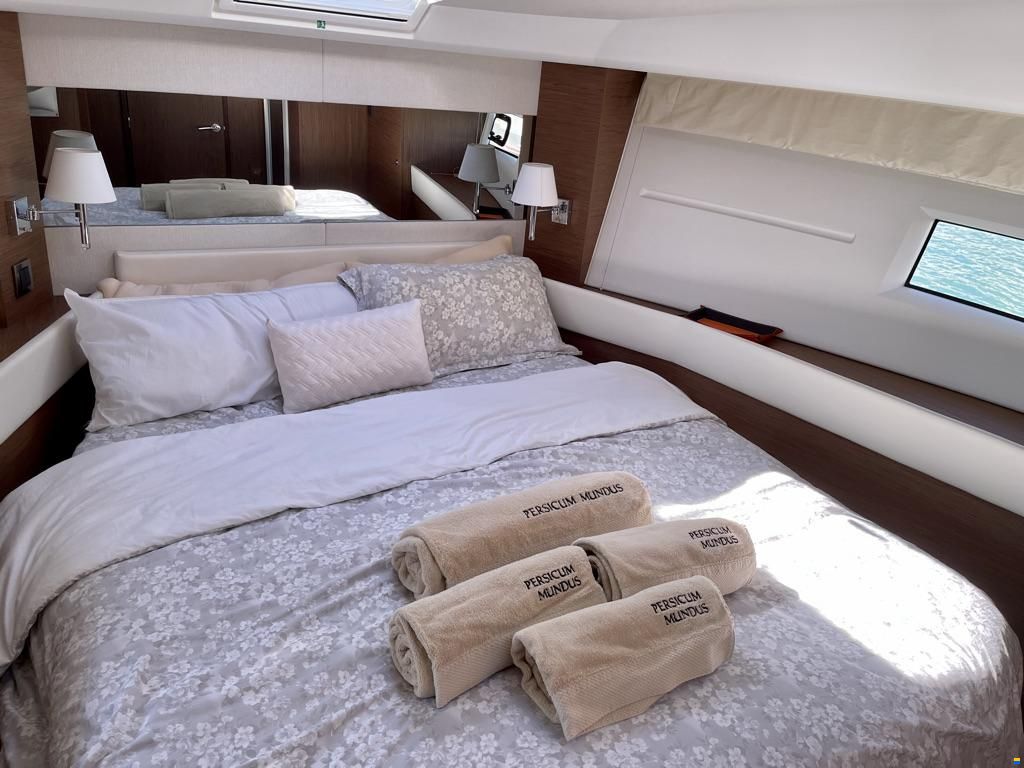The day spaces, including a dining area and an attractive kitchen, are arranged around a spacious living room and have a floor plan designed on one level. The sleeping areas, which are accessed by a comfortable corridor, offer surprising volume in the cabins, bathroom and shower and a true dressing room.