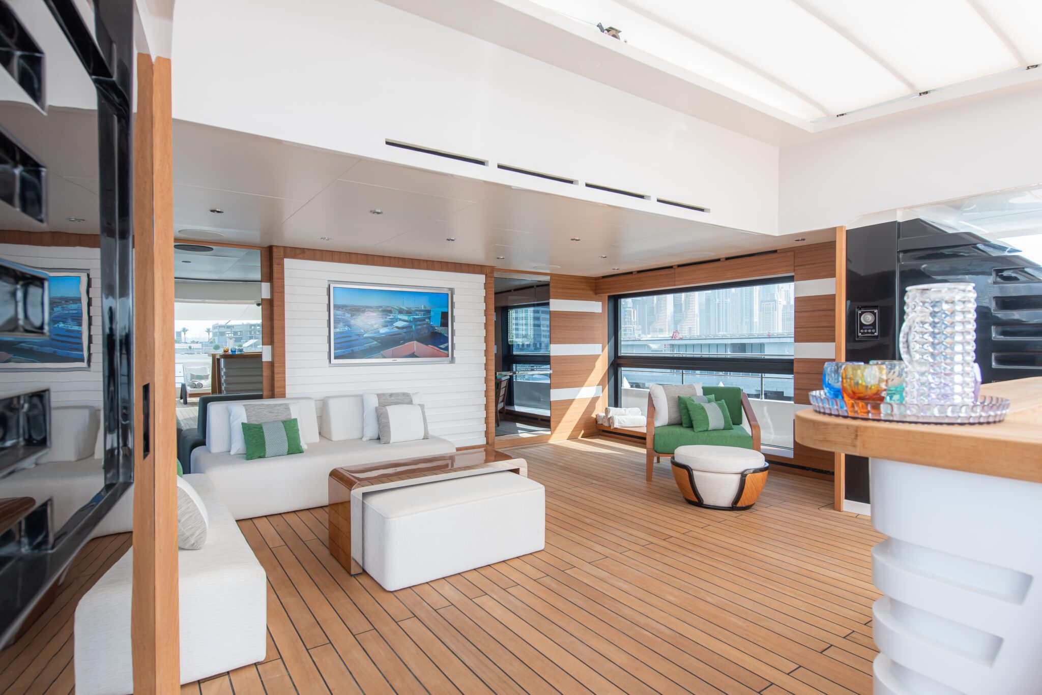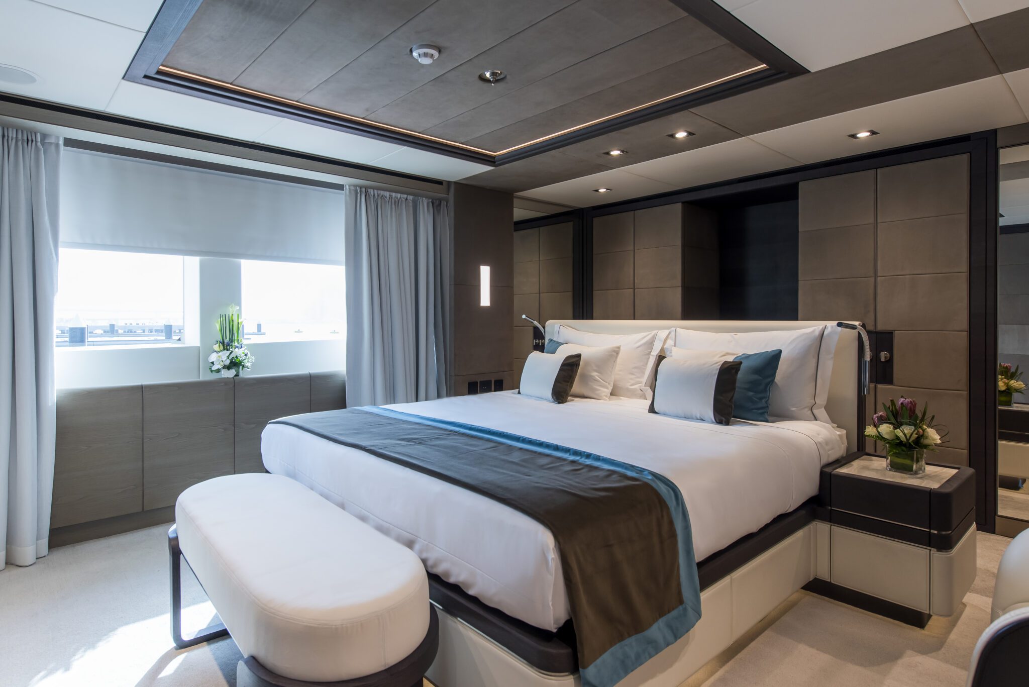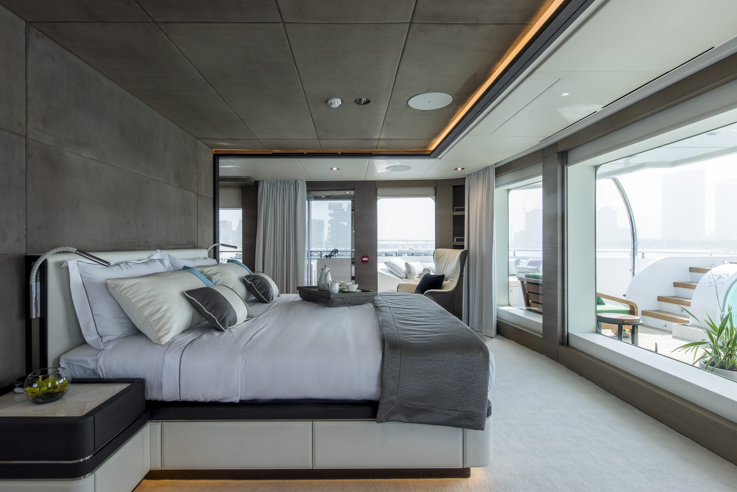 At 56m, the Majesty 175 is designed by the Italian award-winning firm Cristiano Gatto Design Studio. Offering 7 lavish staterooms across its 4 decks, the owner’s suite is situated forward on the upper deck complete with a private swimming pool and outdoor lounge area, a lavish saloon and dining area, and several deck areas for al fresco dining giving the owner and his guests uncompromising comfort. The striking 780 GT mega yacht also offers an array of amenities, such as the beach club astern, the toy garage, an optional jacuzzi, and more.