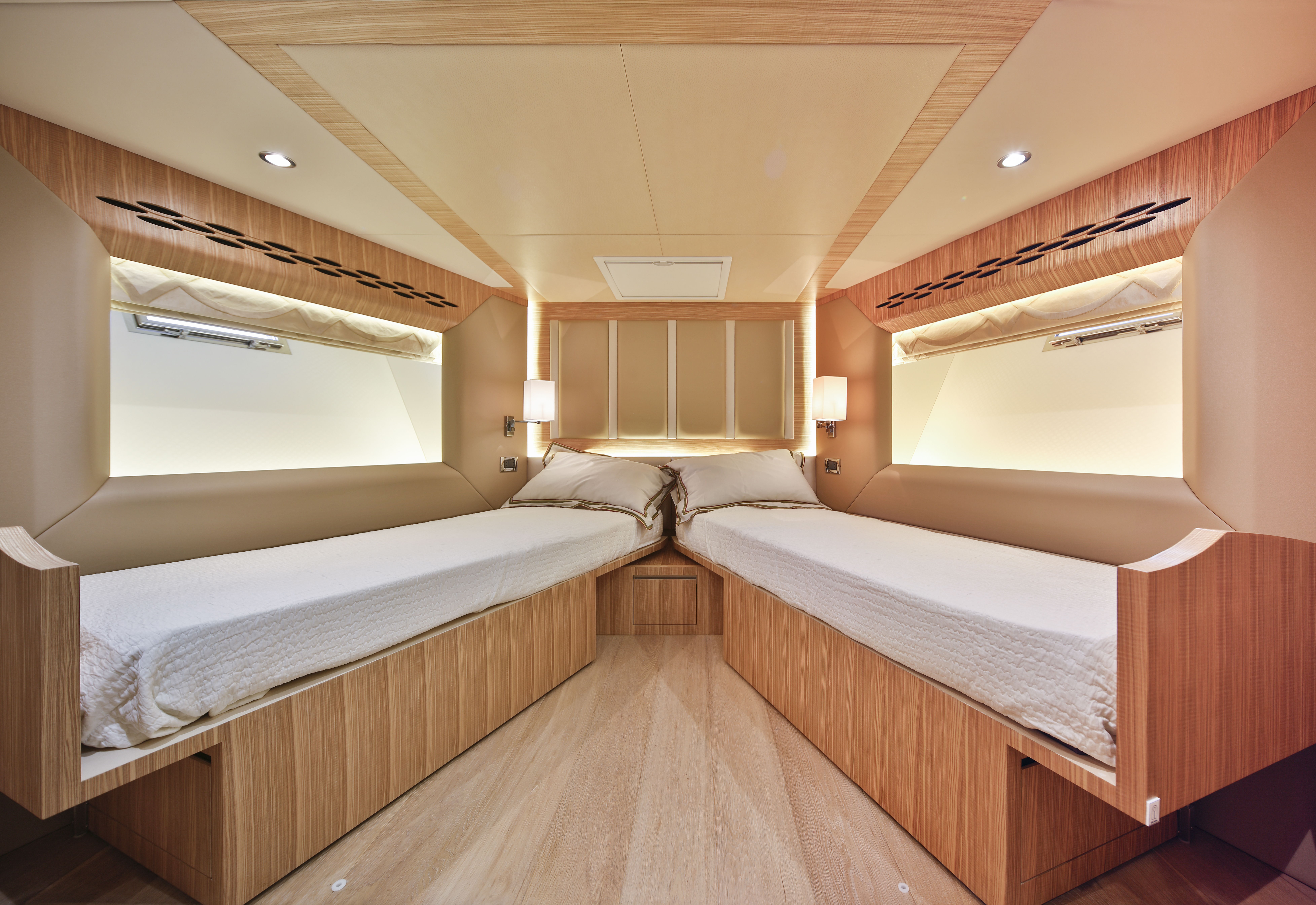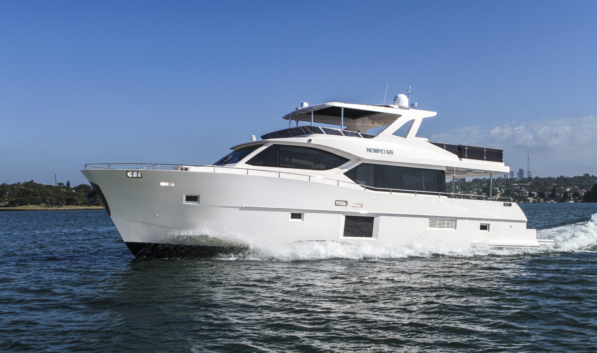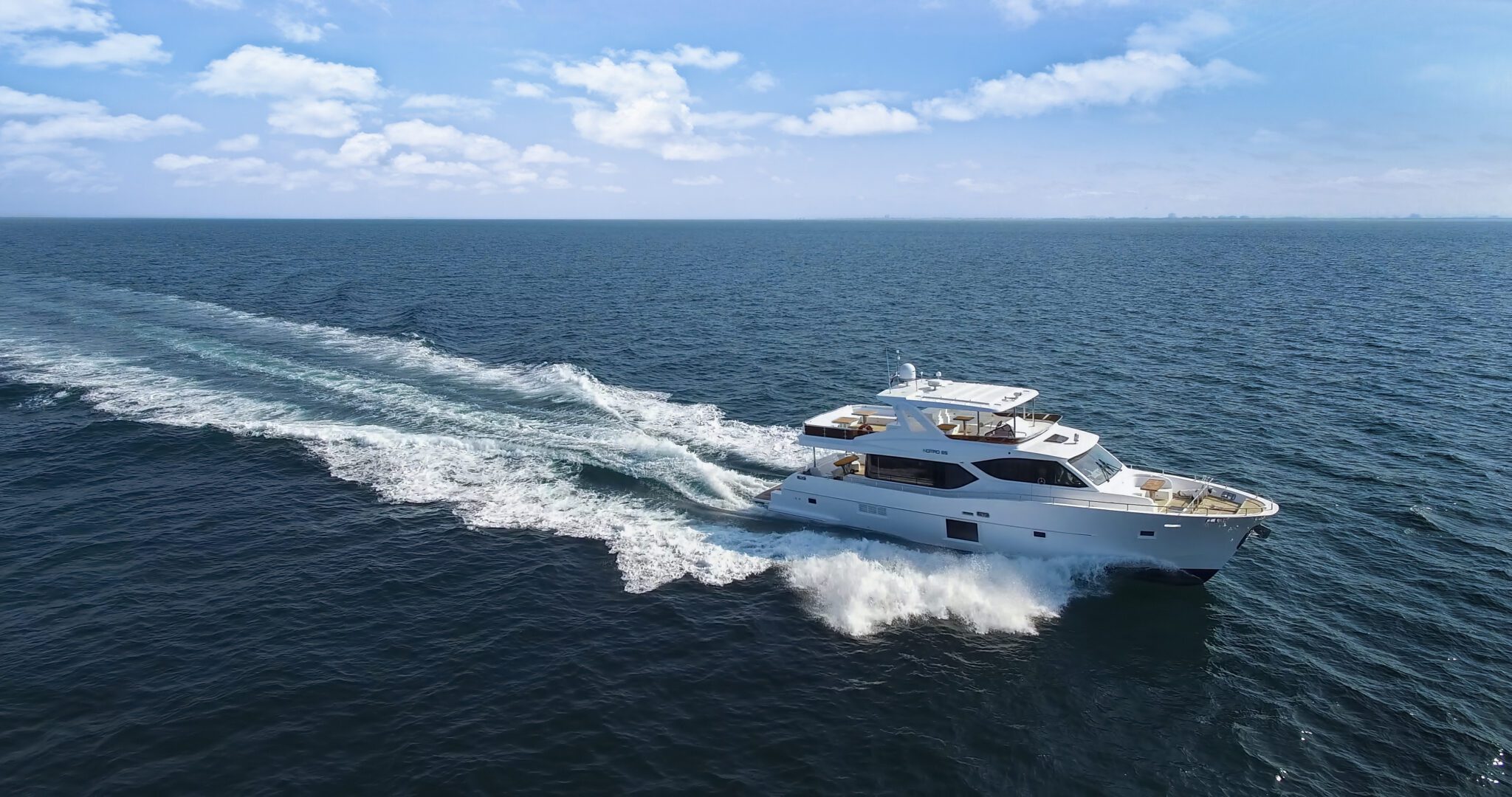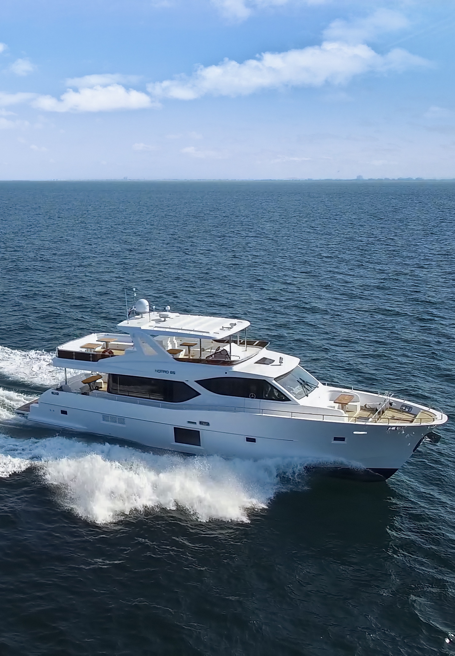 The first hybrid hull from Gulf Craft, the Nomad 65 is chic yet powerful and feels ultra-roomy due to a free-flowing use of onboard space. With large above and below-deck quarters, guests can enjoy extended time out at sea. This yacht offers a fantastic overall package of features, including a huge fly-bridge space for a 65-foot yacht.