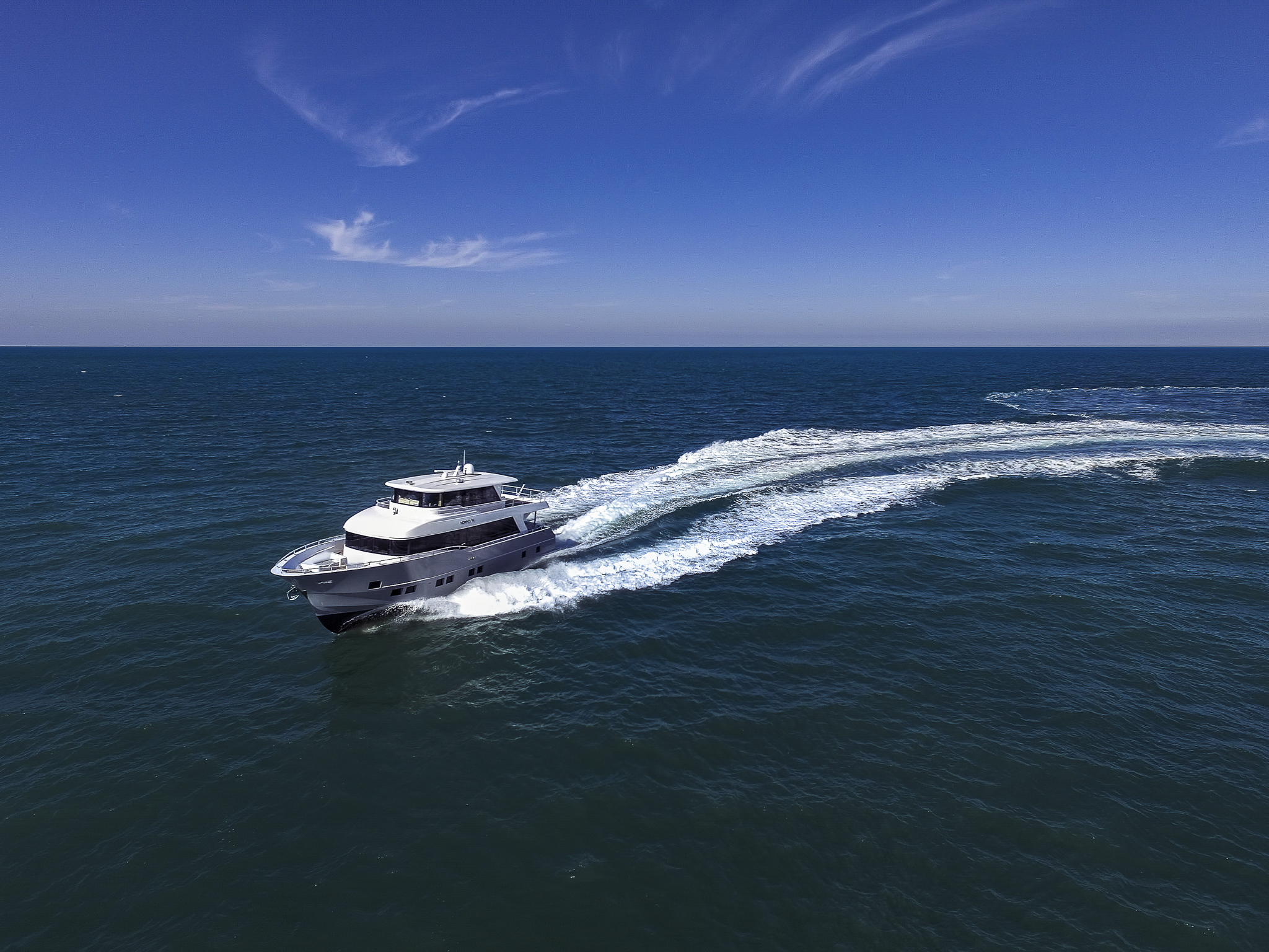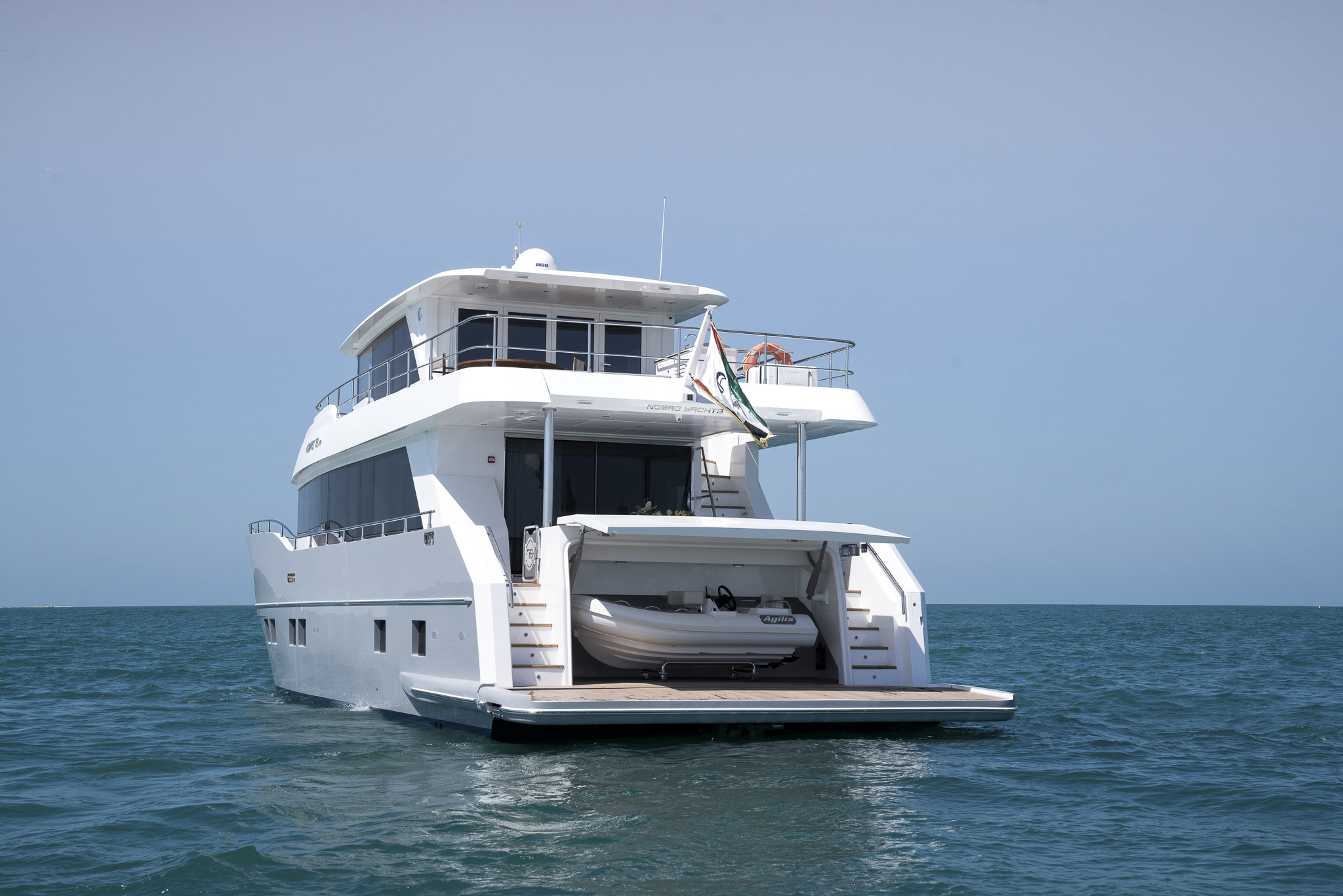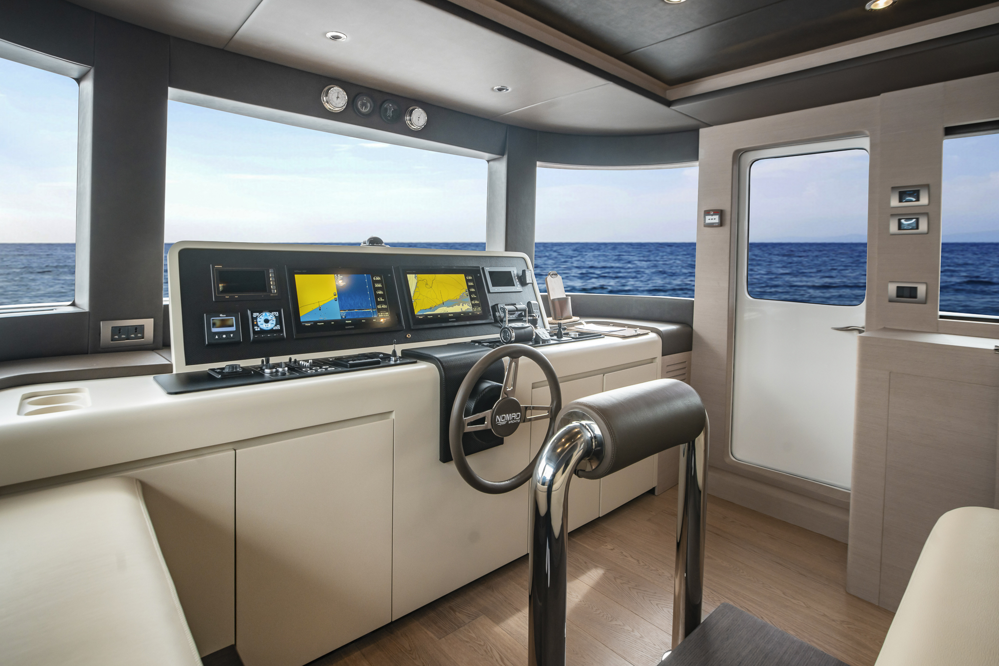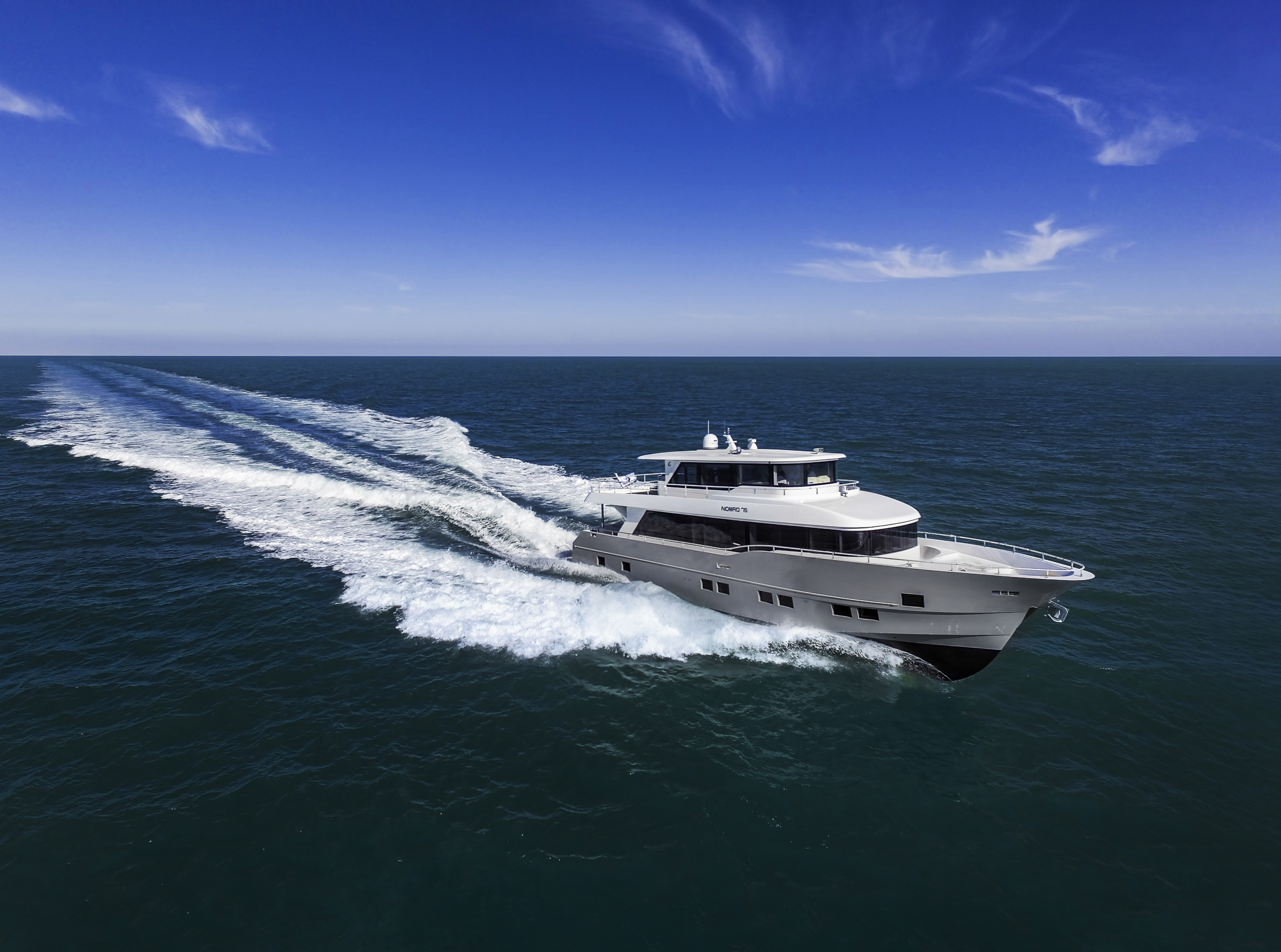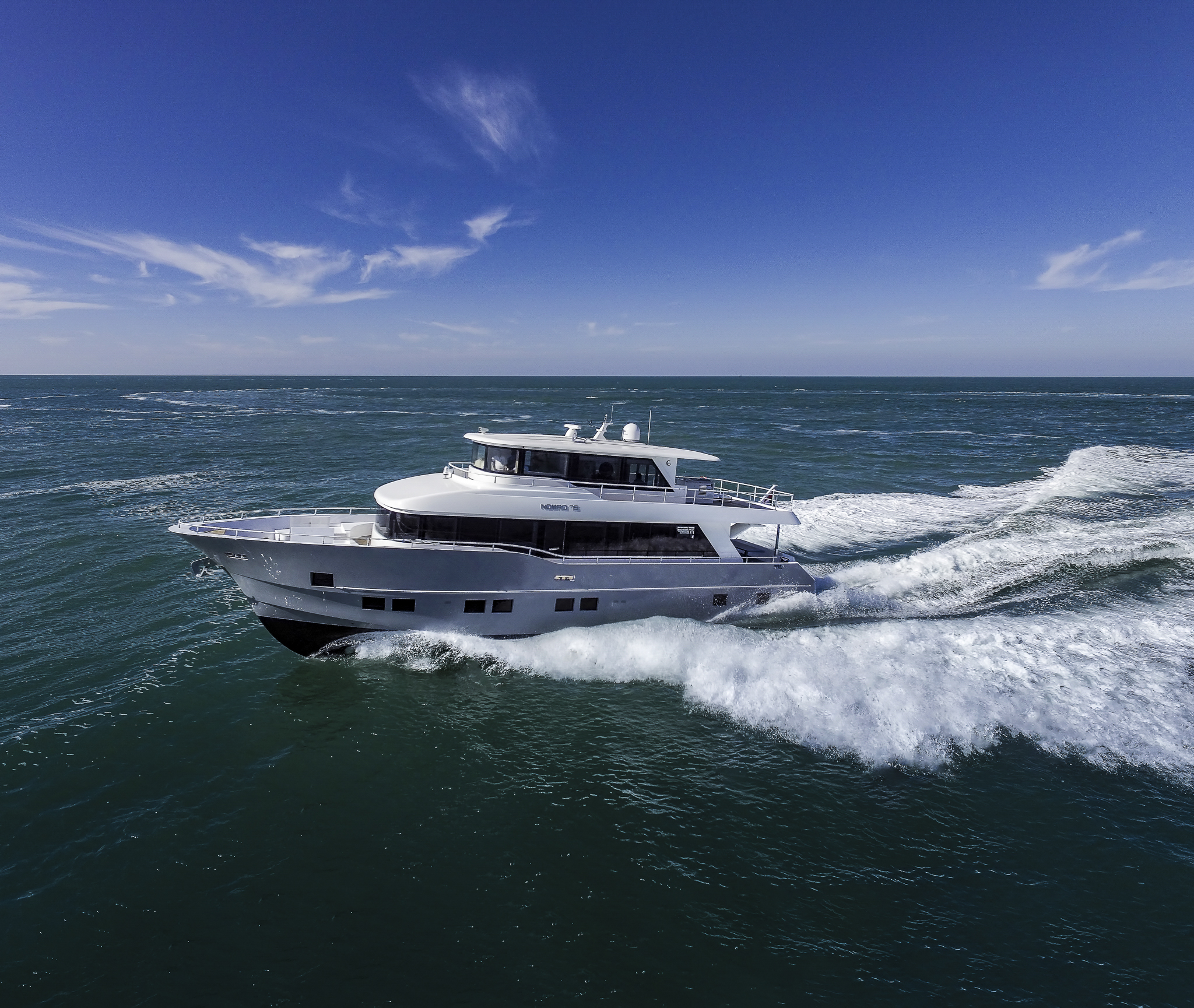 The ground-breaking Nomad 75 gives the feeling of being on a much larger yacht. With generous outside areas and a private sky lounge it is perfect for a long distance cruising in the utmost comfort. Taking things up a level, the boat boasts a definite highlight: the spacious owner’s stateroom, unexpectedly located on the main deck, offering incredible 180-degree panoramic views out to sea. With four double guest cabins and extensive crew quarters, the 75 SUV is ideal for longer passage making. At the same time, an intelligent layout allows guests to interact with each other seamlessly, while guaranteeing privacy when required.