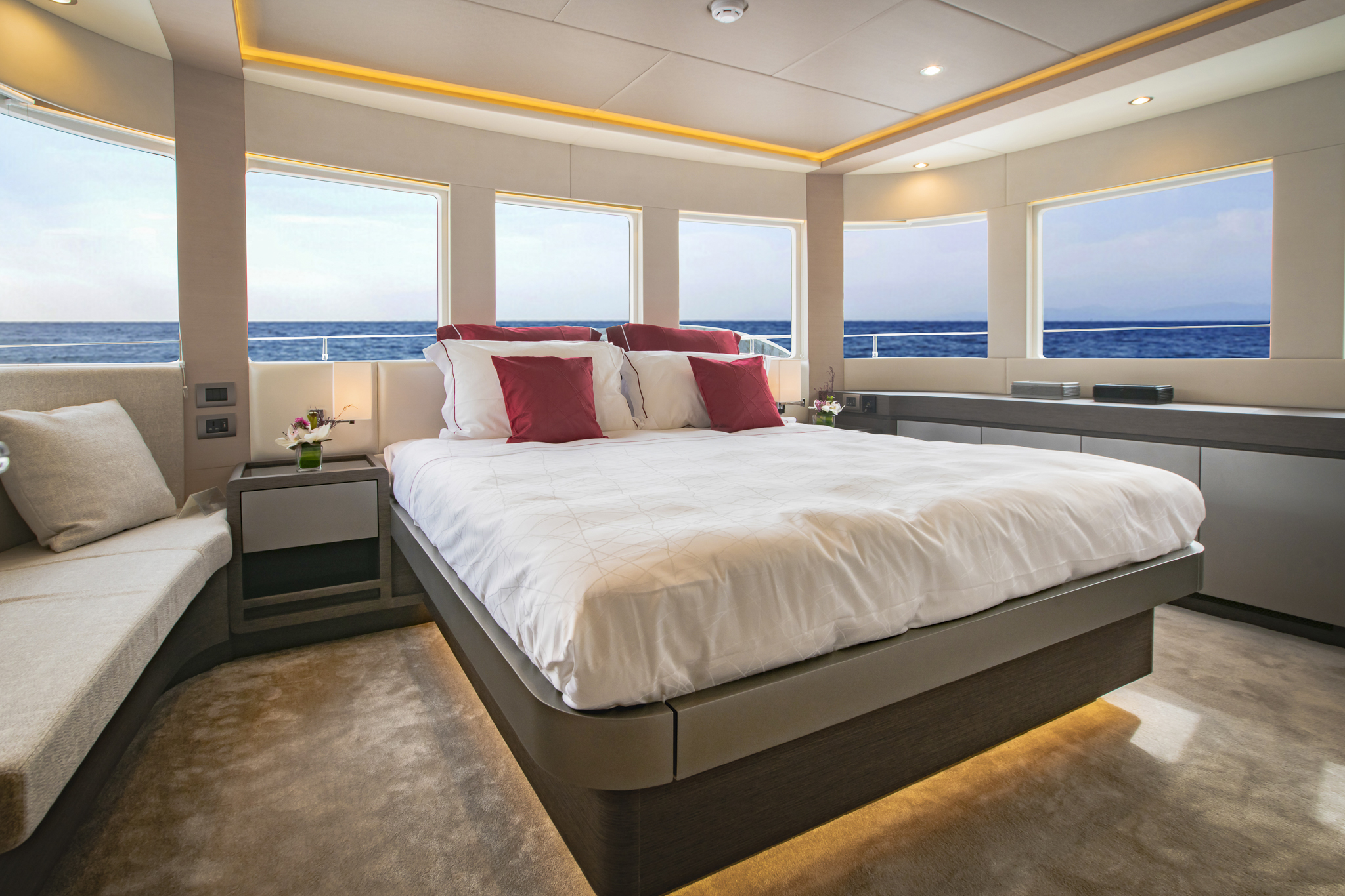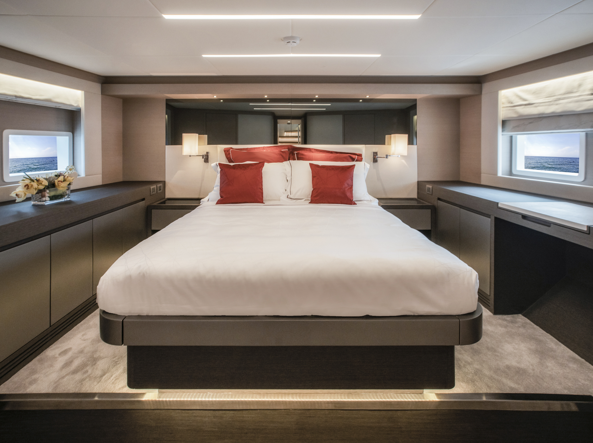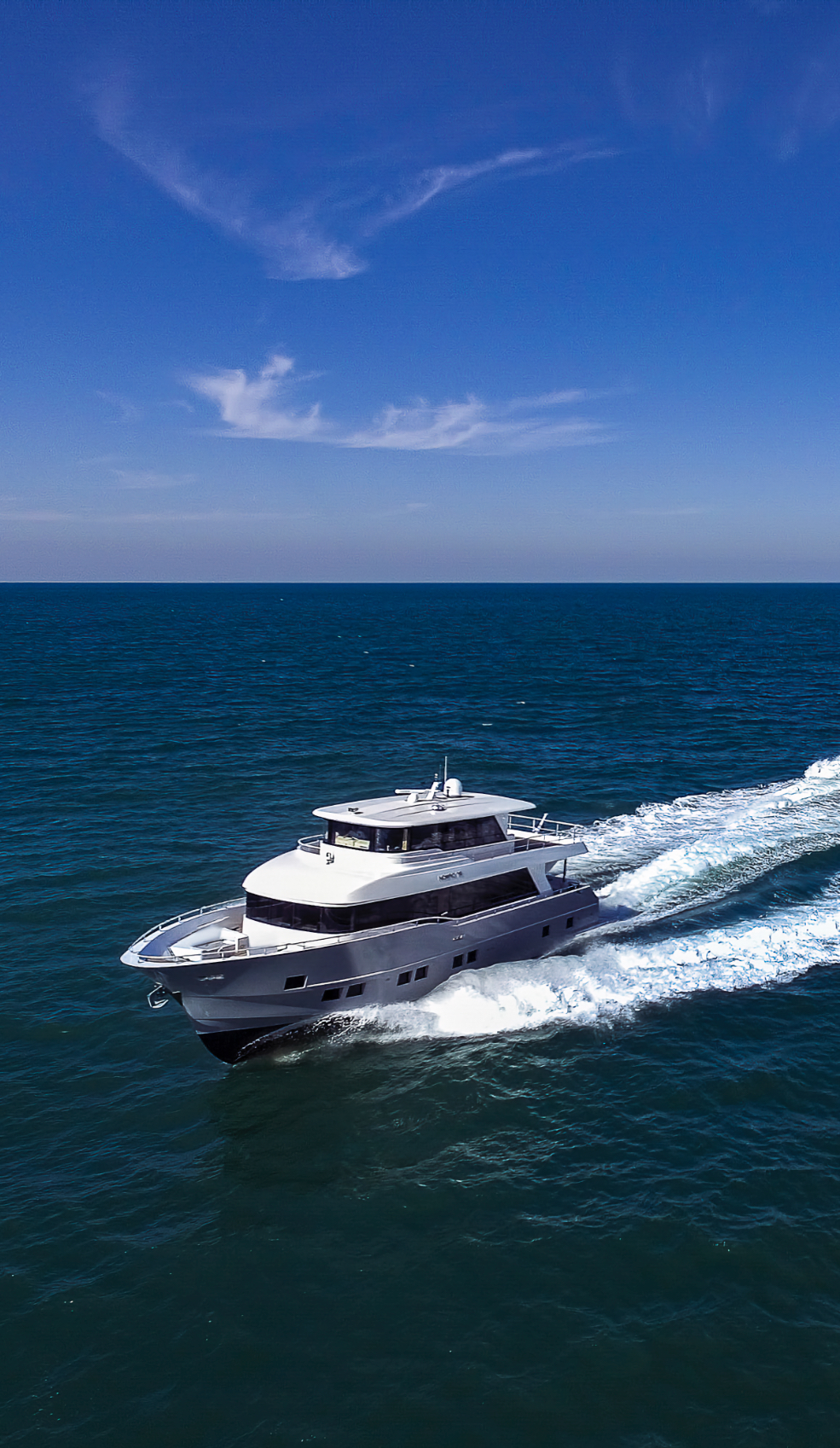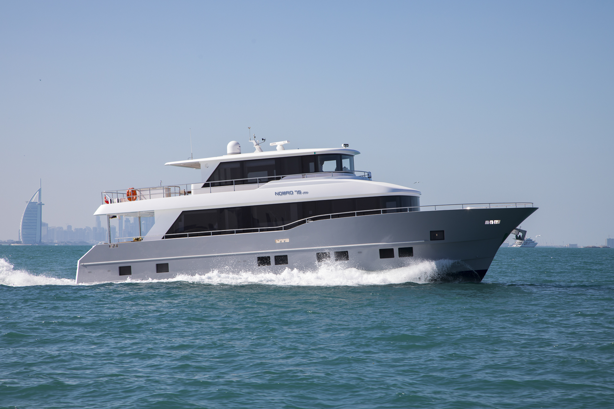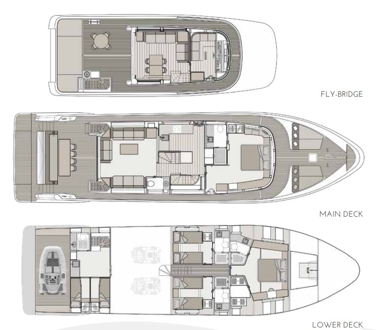 The ground-breaking Nomad 75 gives the feeling of being on a much larger yacht. With generous outside areas and a private sky lounge it is perfect for a long distance cruising in the utmost comfort. Taking things up a level, the boat boasts a definite highlight: the spacious owner’s stateroom, unexpectedly located on the main deck, offering incredible 180-degree panoramic views out to sea. With four double guest cabins and extensive crew quarters, the 75 SUV is ideal for longer passage making. At the same time, an intelligent layout allows guests to interact with each other seamlessly, while guaranteeing privacy when required.