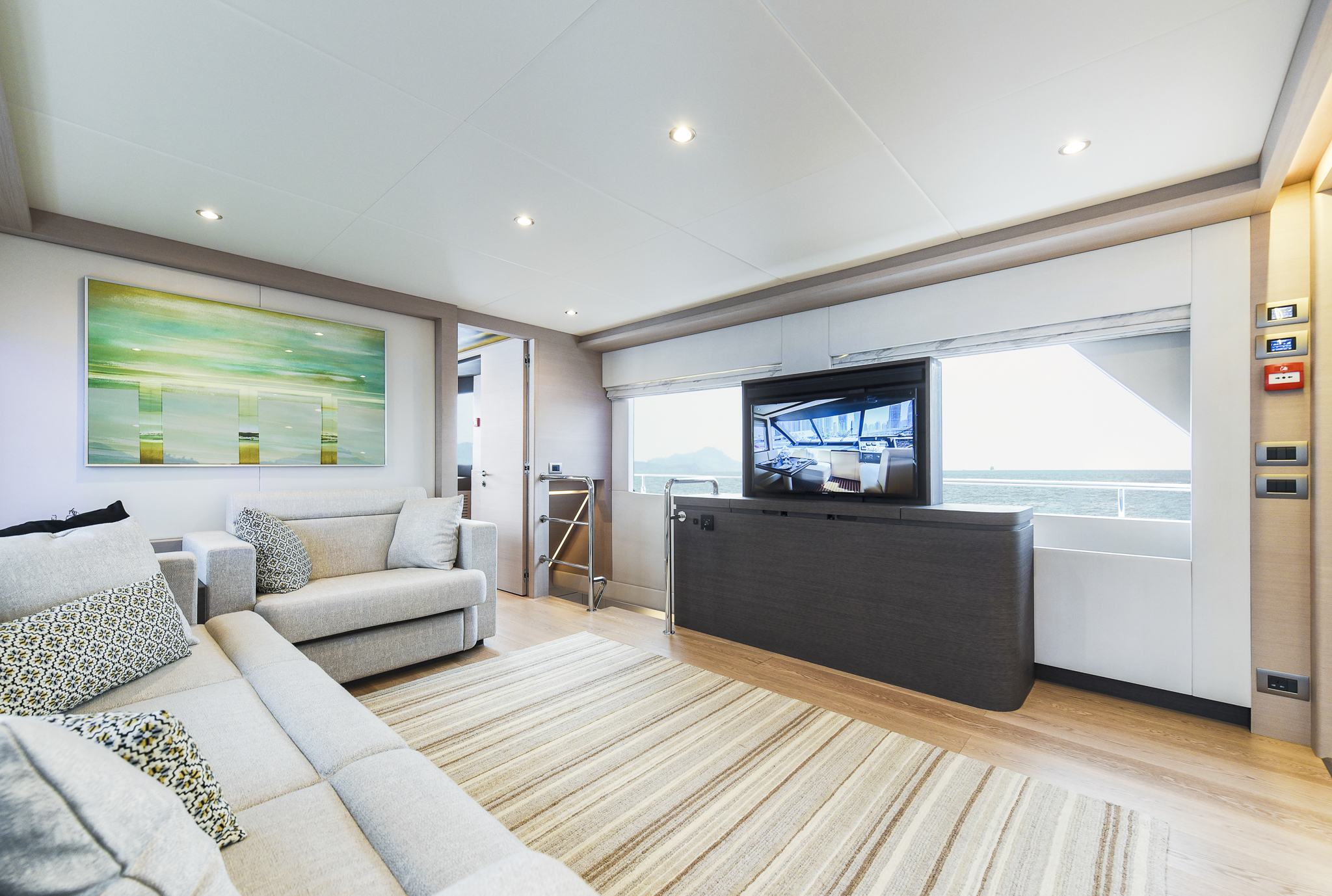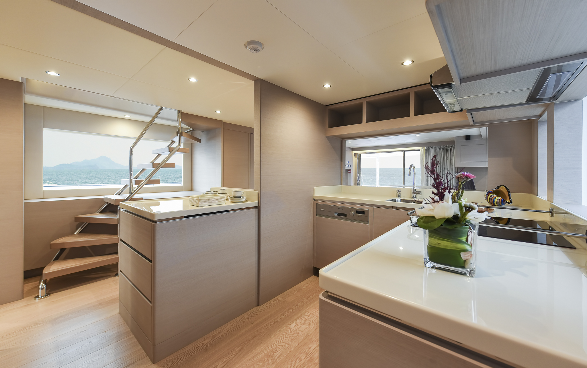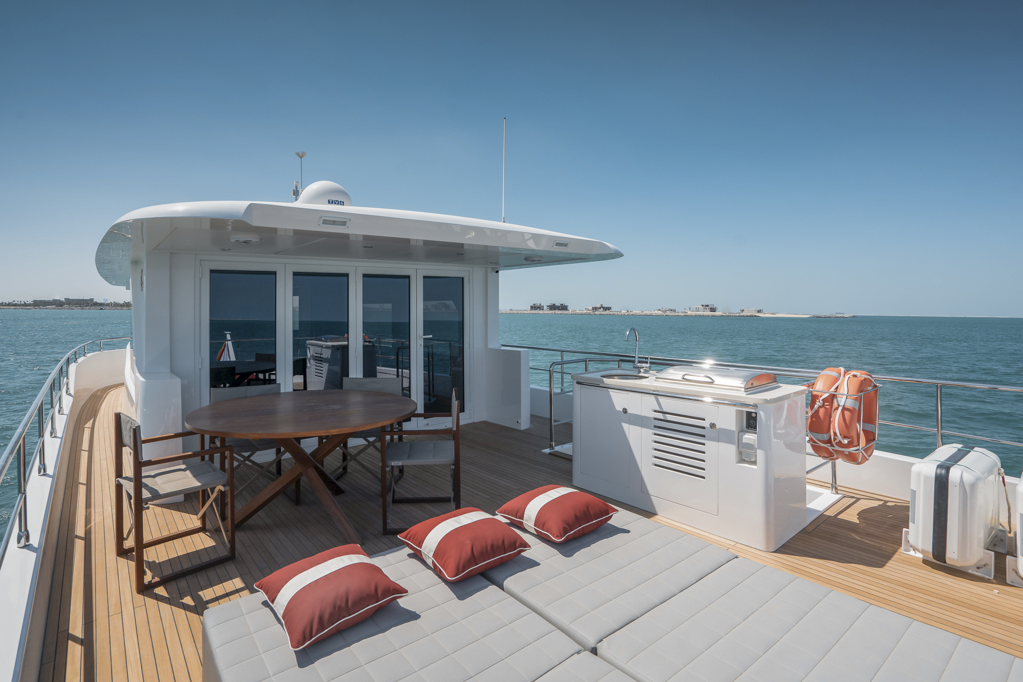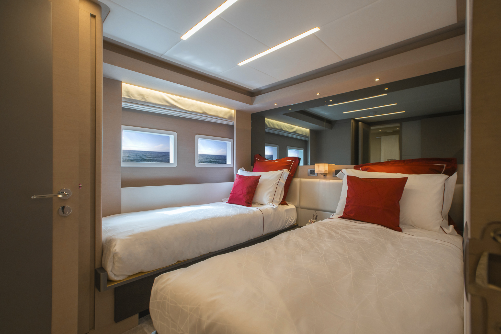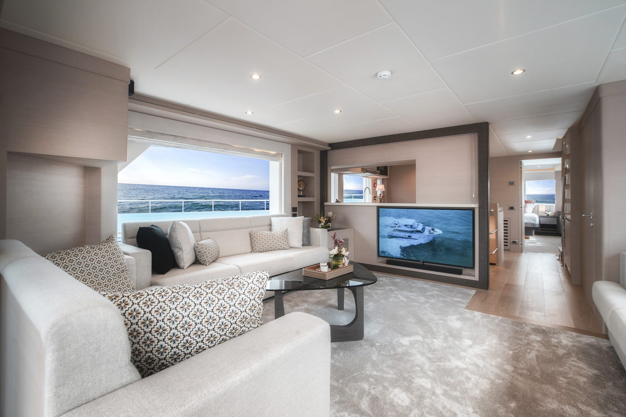 The ground-breaking Nomad 75 gives the feeling of being on a much larger yacht. With generous outside areas and a private sky lounge it is perfect for a long distance cruising in the utmost comfort. Taking things up a level, the boat boasts a definite highlight: the spacious owner’s stateroom, unexpectedly located on the main deck, offering incredible 180-degree panoramic views out to sea. With four double guest cabins and extensive crew quarters, the 75 SUV is ideal for longer passage making. At the same time, an intelligent layout allows guests to interact with each other seamlessly, while guaranteeing privacy when required.