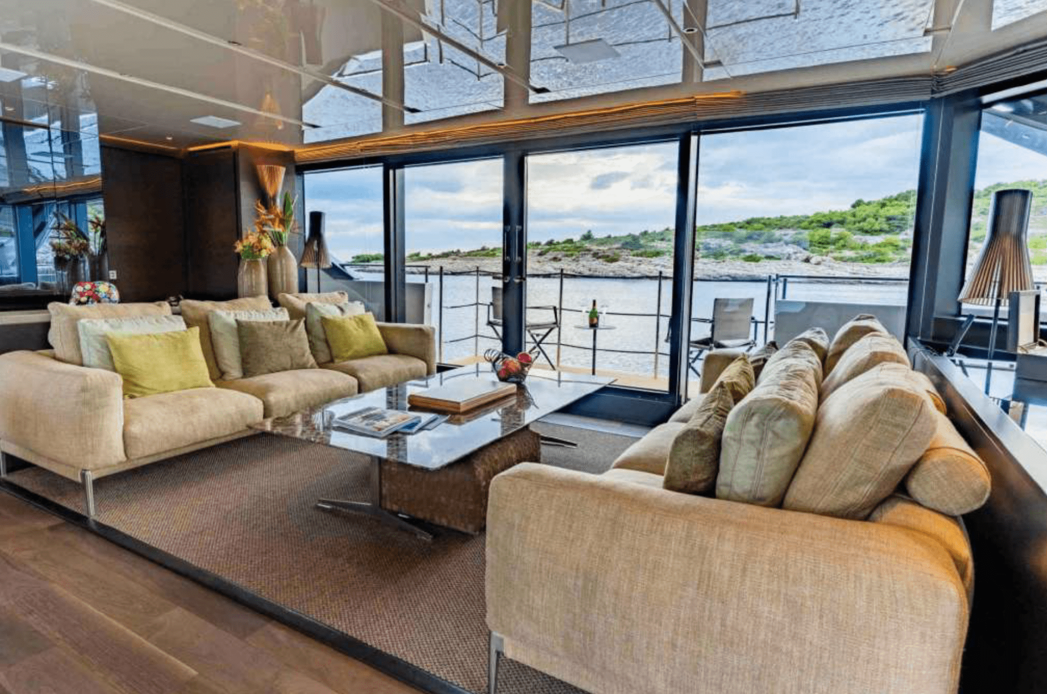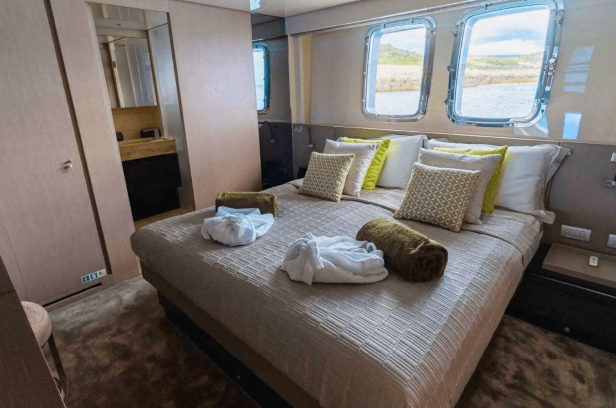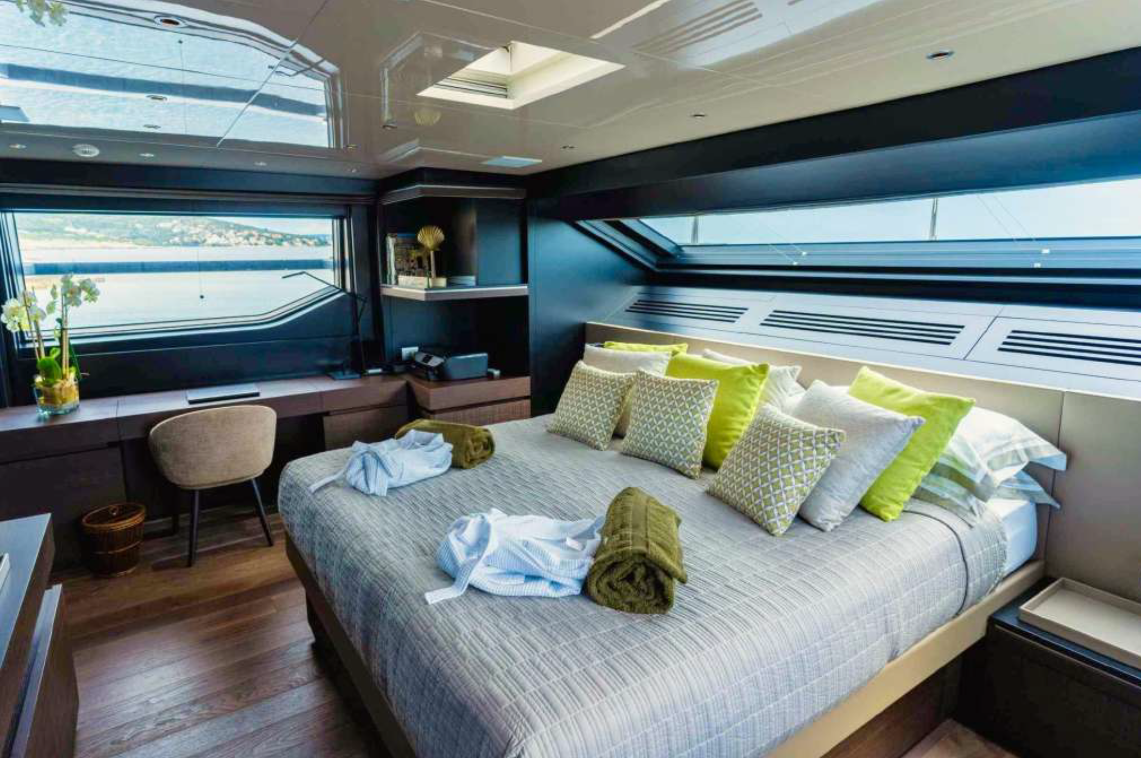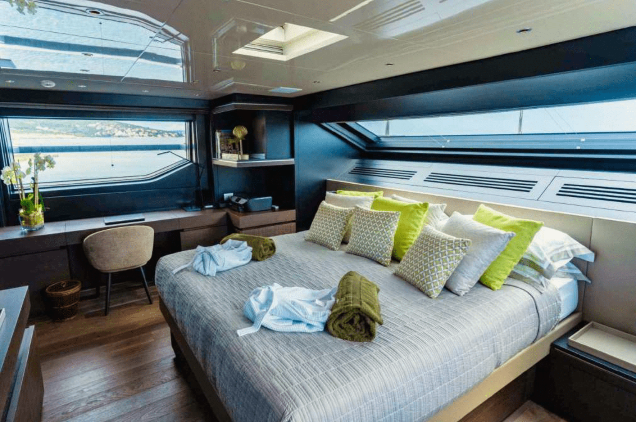 The master cabin is positioned forward and accessible via a side door on the single side deck, ensuring maximum privacy. Enjoy top speeds of around 28-29 knots and a cruising speed of 25 knots with the twin 16V MTU engines.
