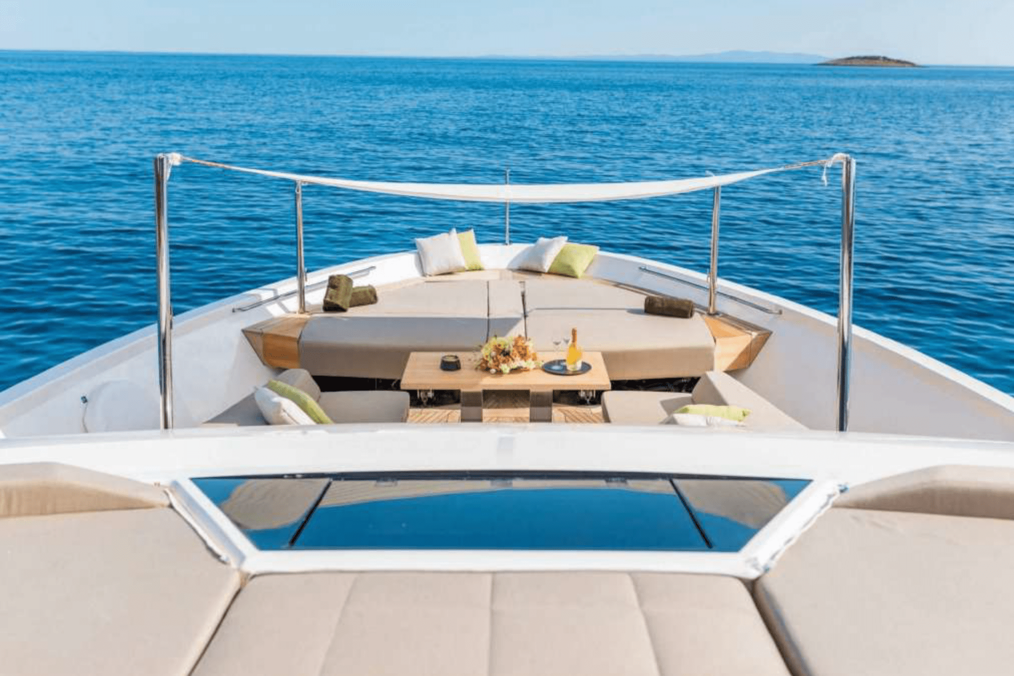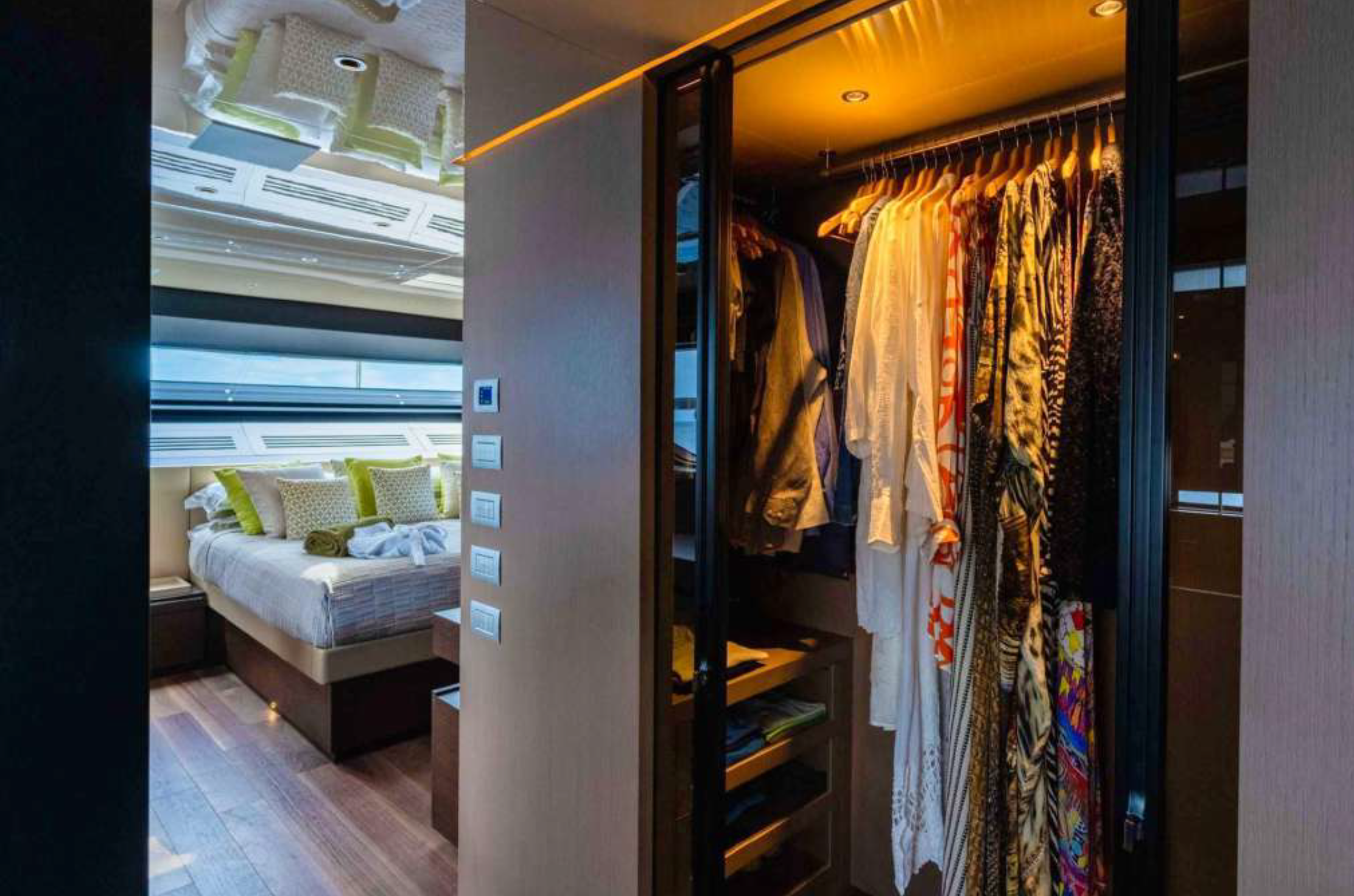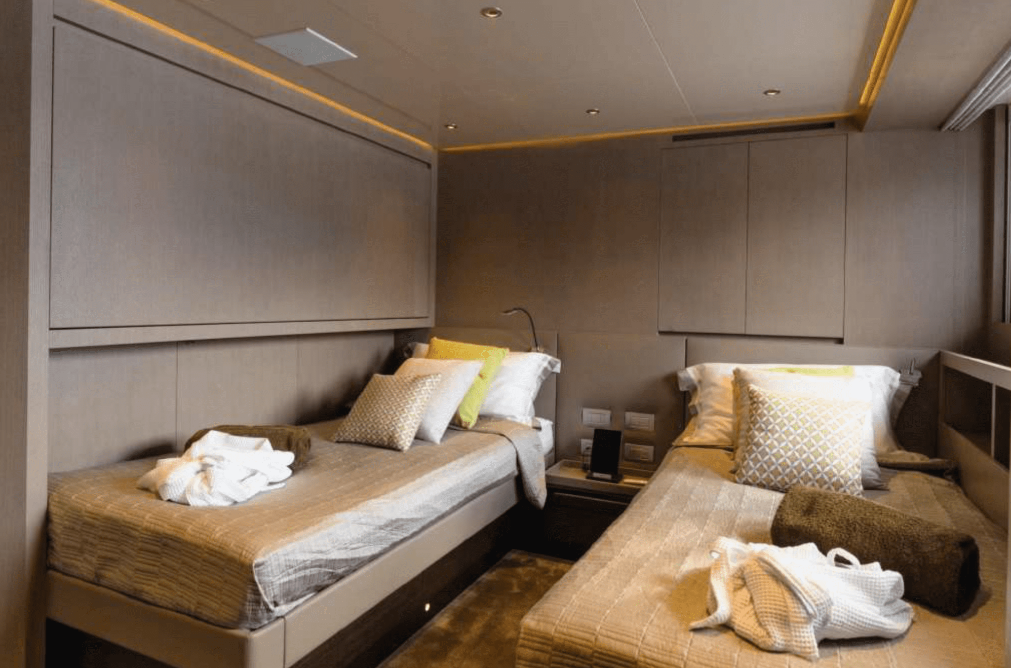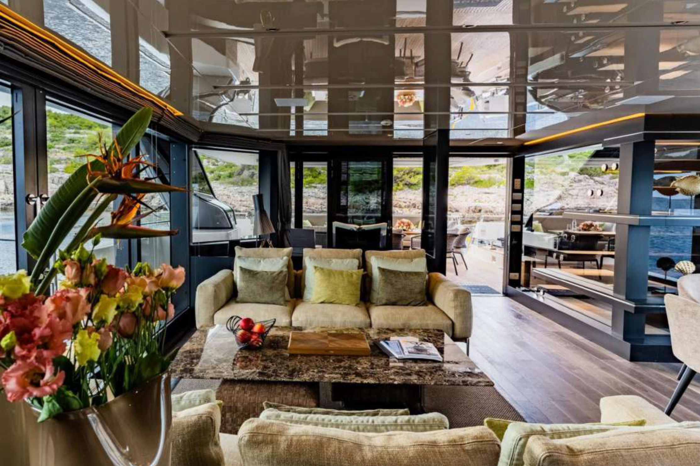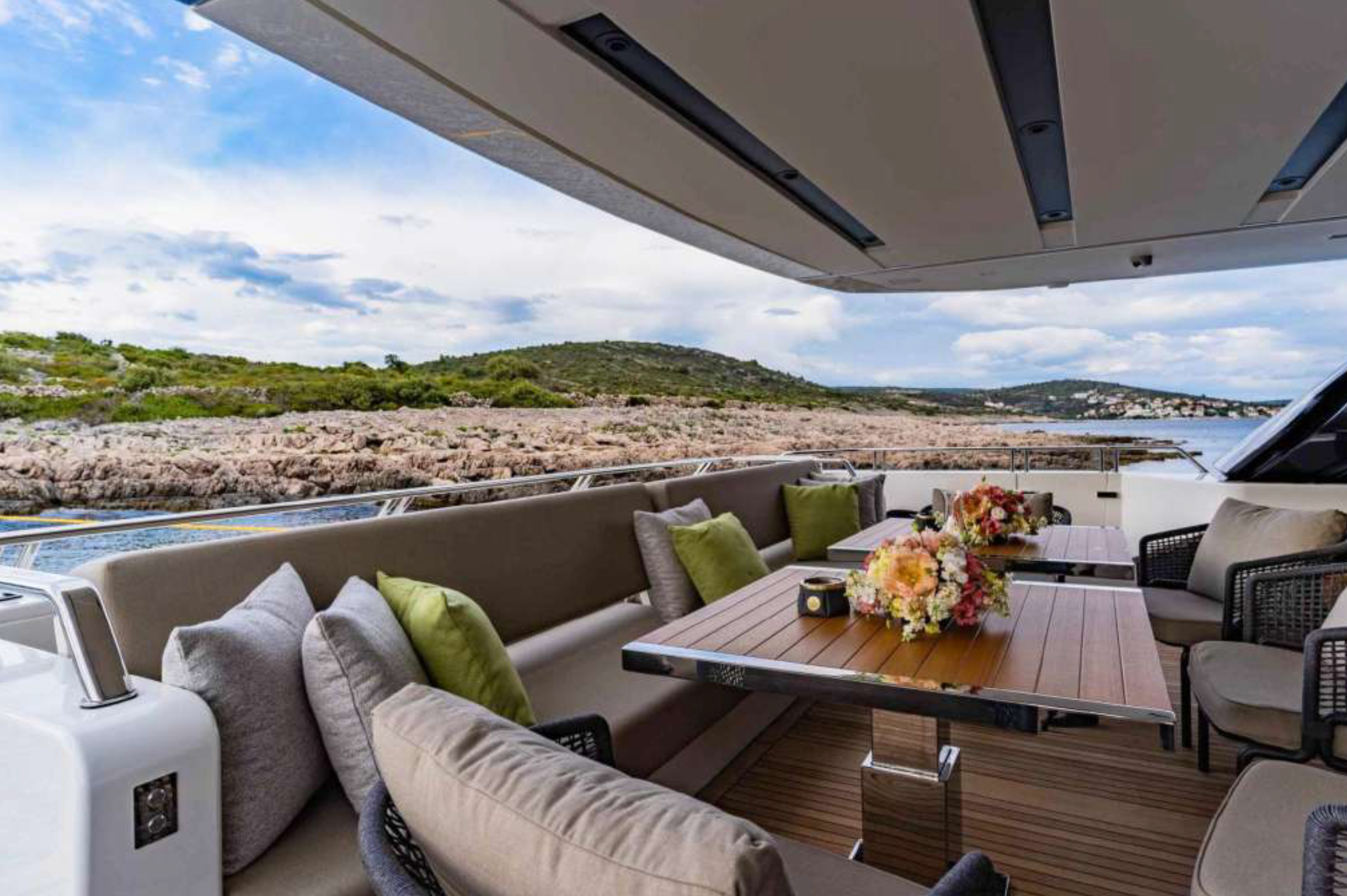 The master cabin is positioned forward and accessible via a side door on the single side deck, ensuring maximum privacy. Enjoy top speeds of around 28-29 knots and a cruising speed of 25 knots with the twin 16V MTU engines.