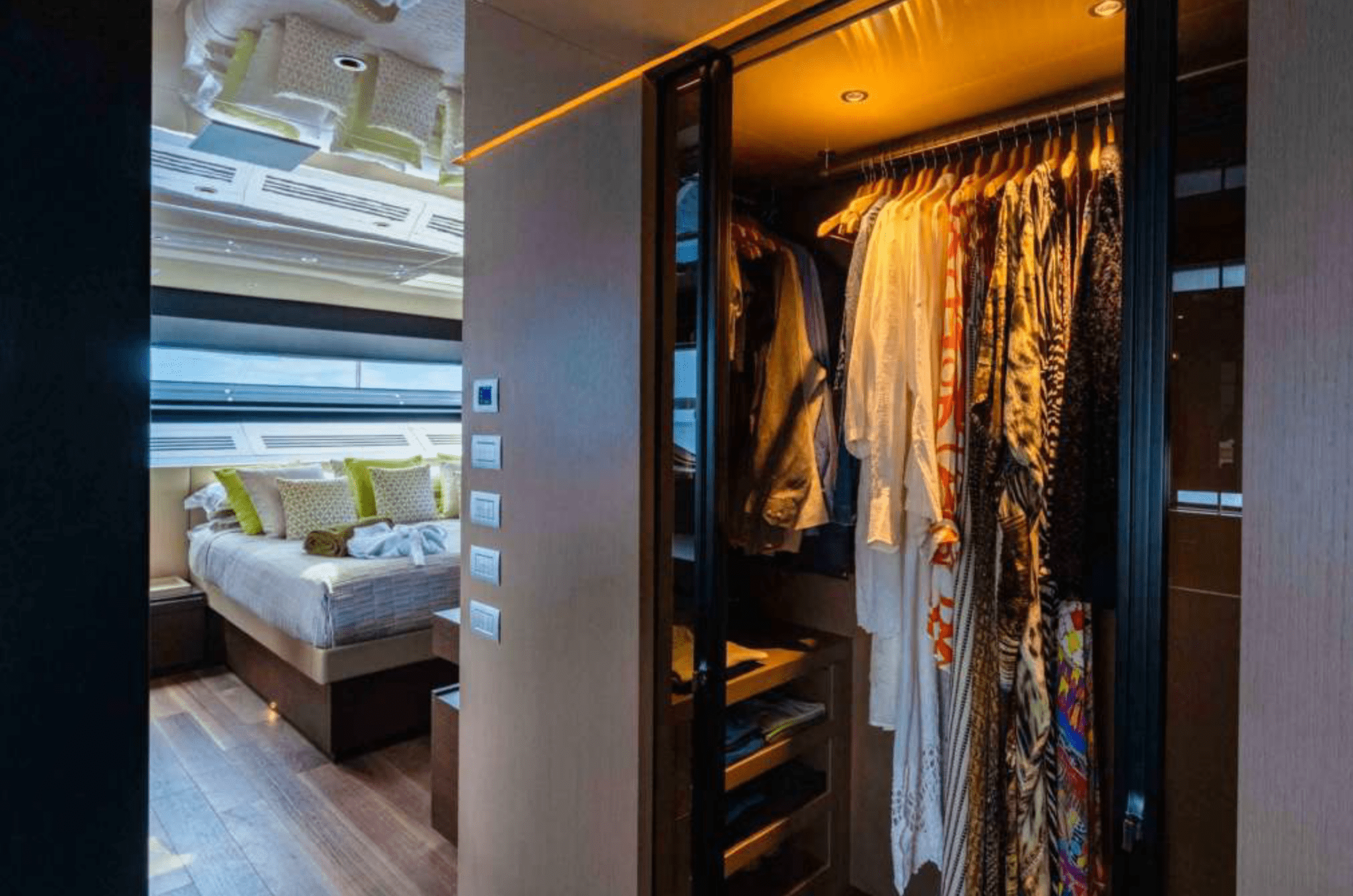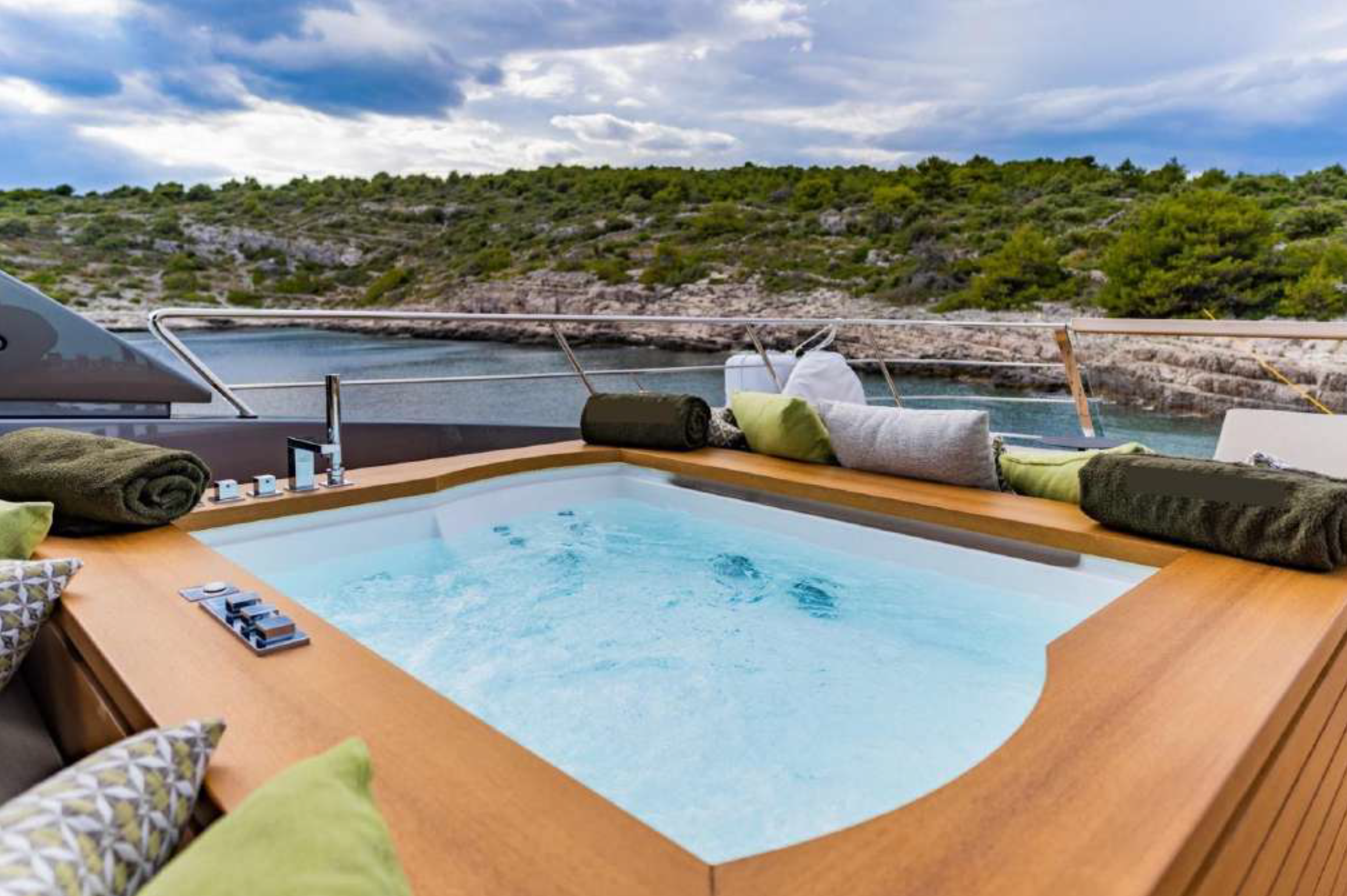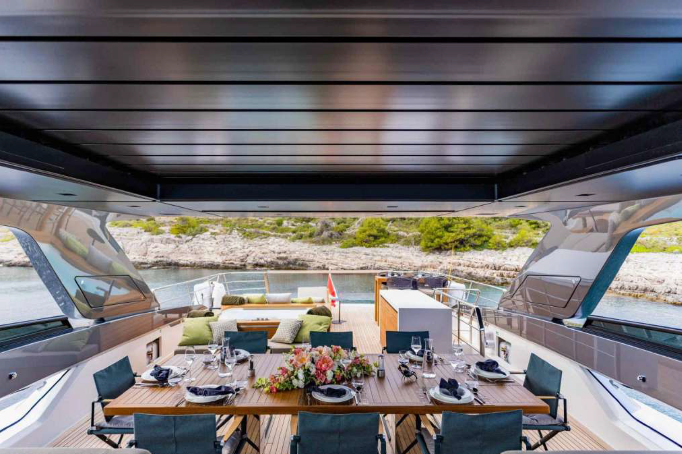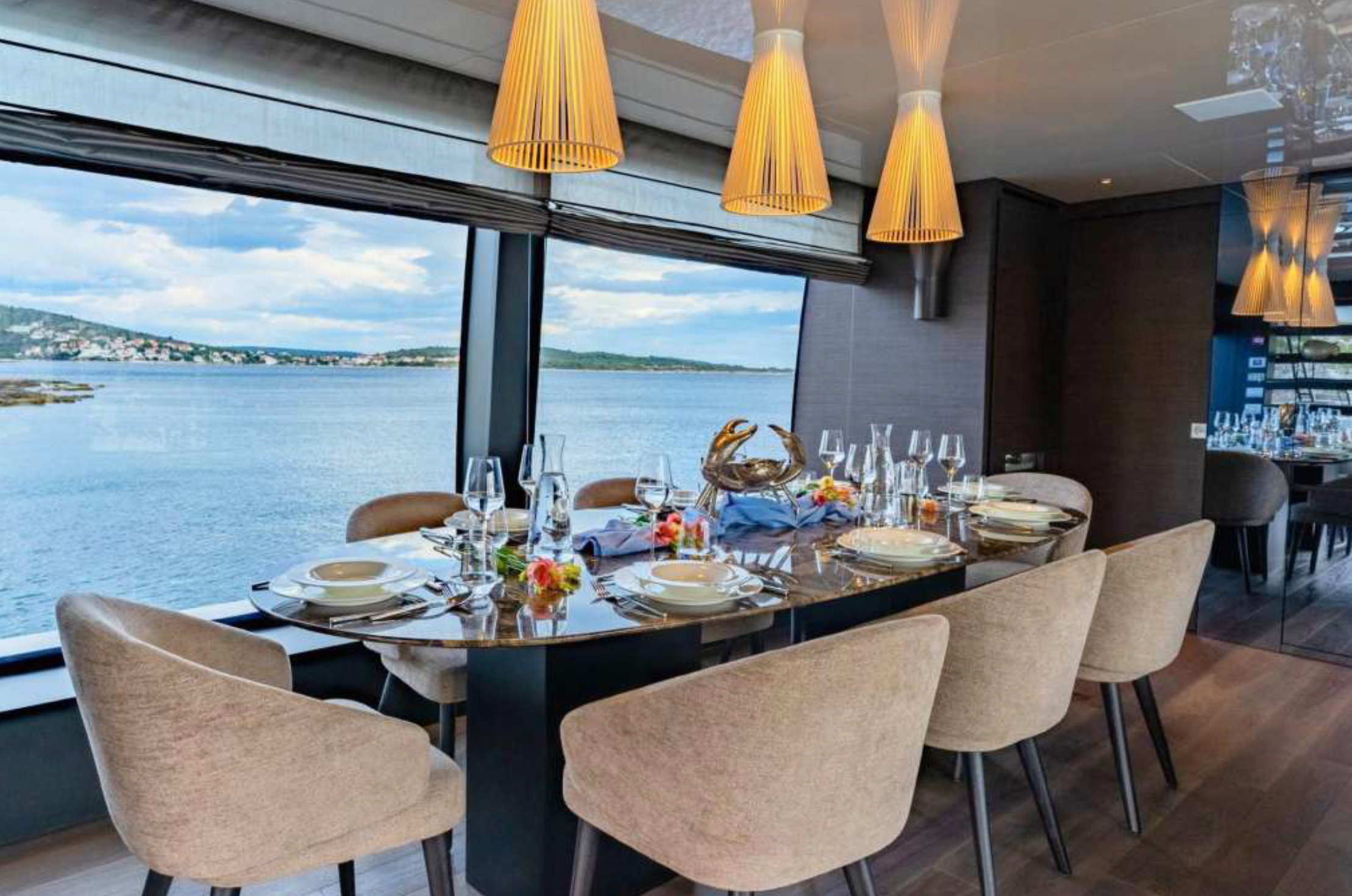 The master cabin is positioned forward and accessible via a side door on the single side deck, ensuring maximum privacy. Enjoy top speeds of around 28-29 knots and a cruising speed of 25 knots with the twin 16V MTU engines.
