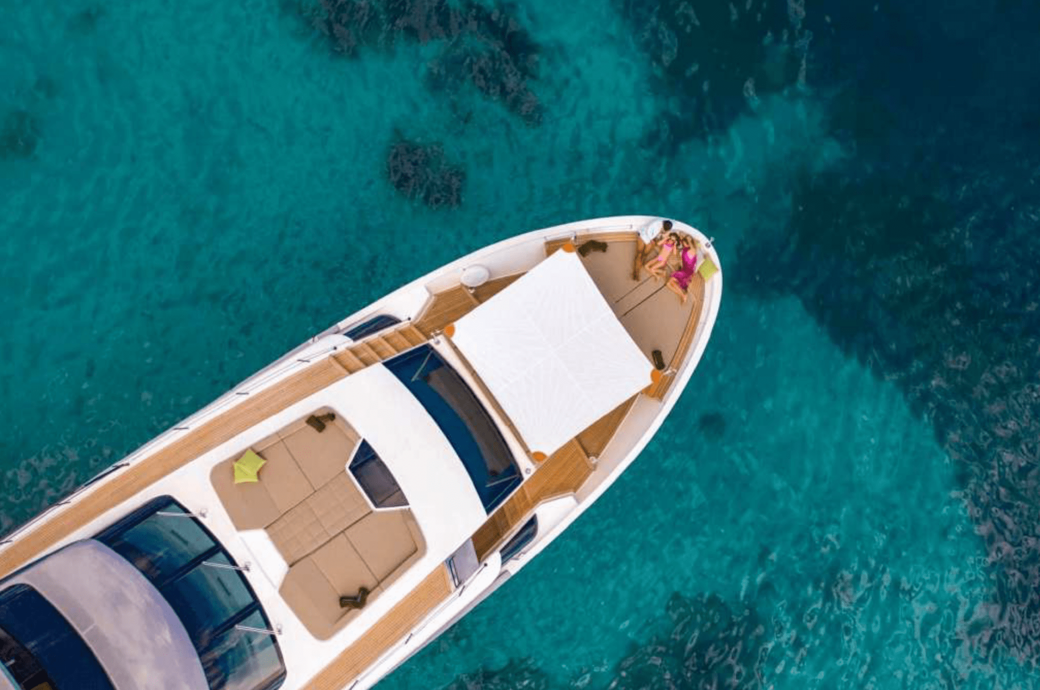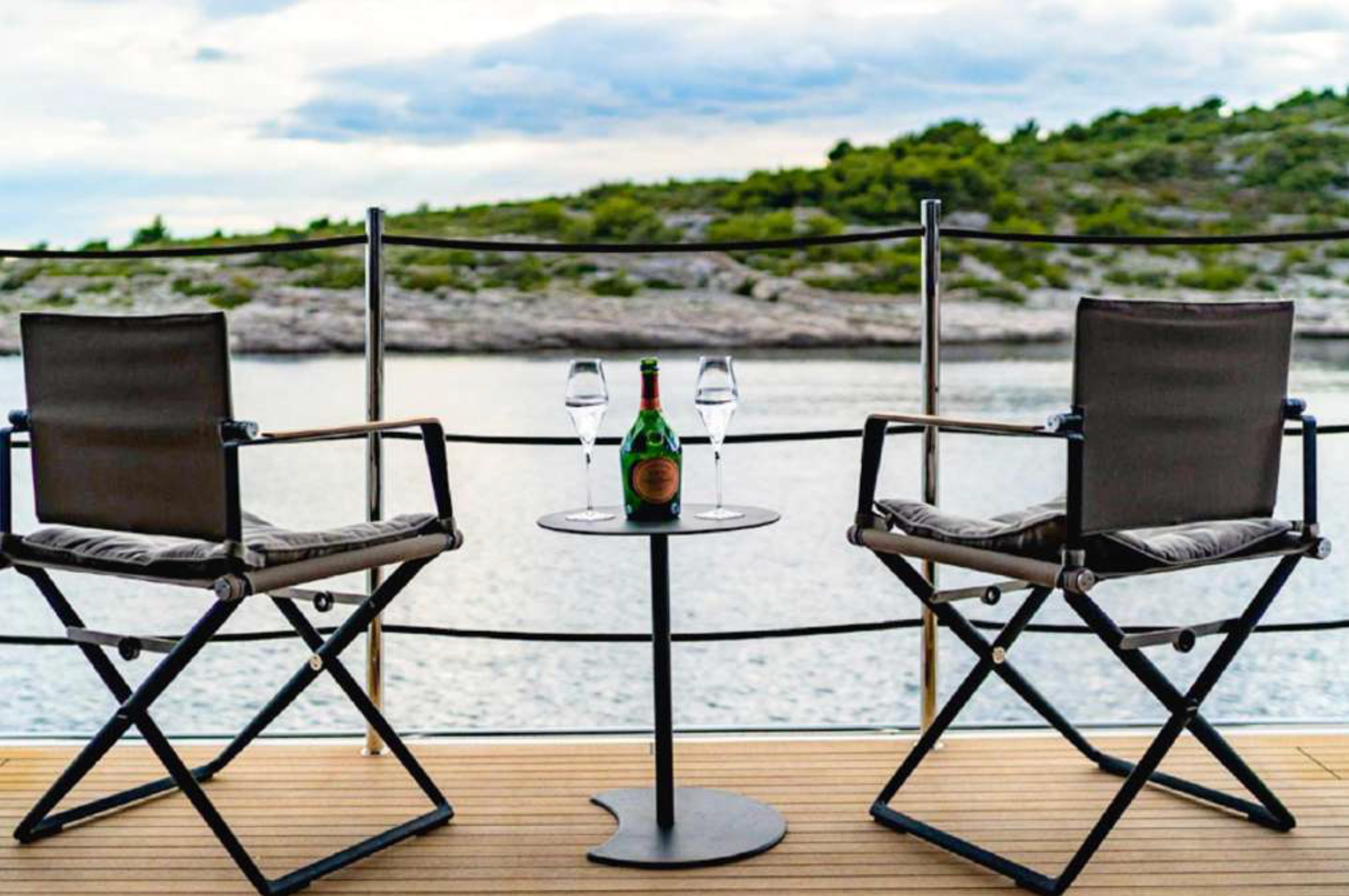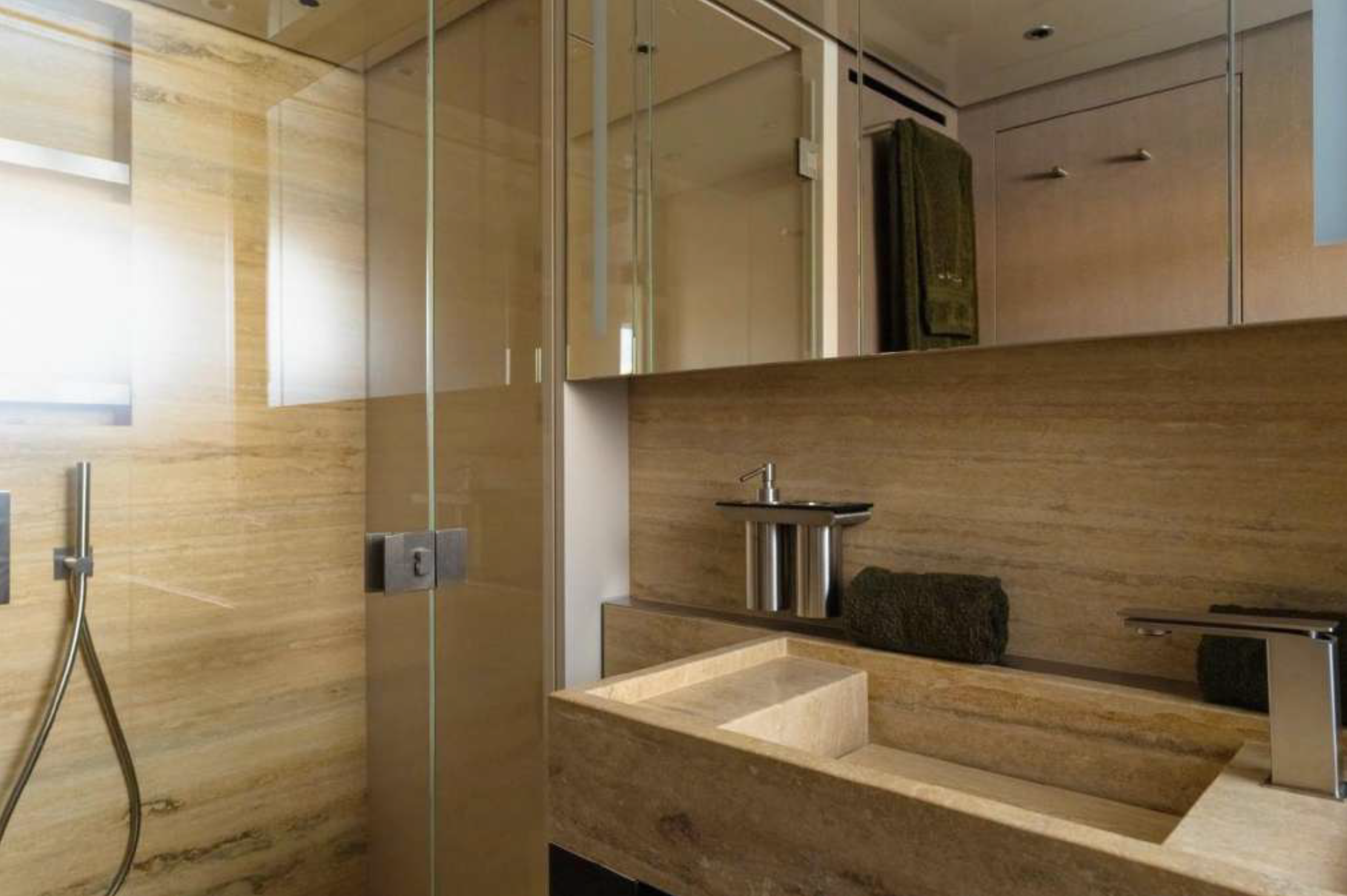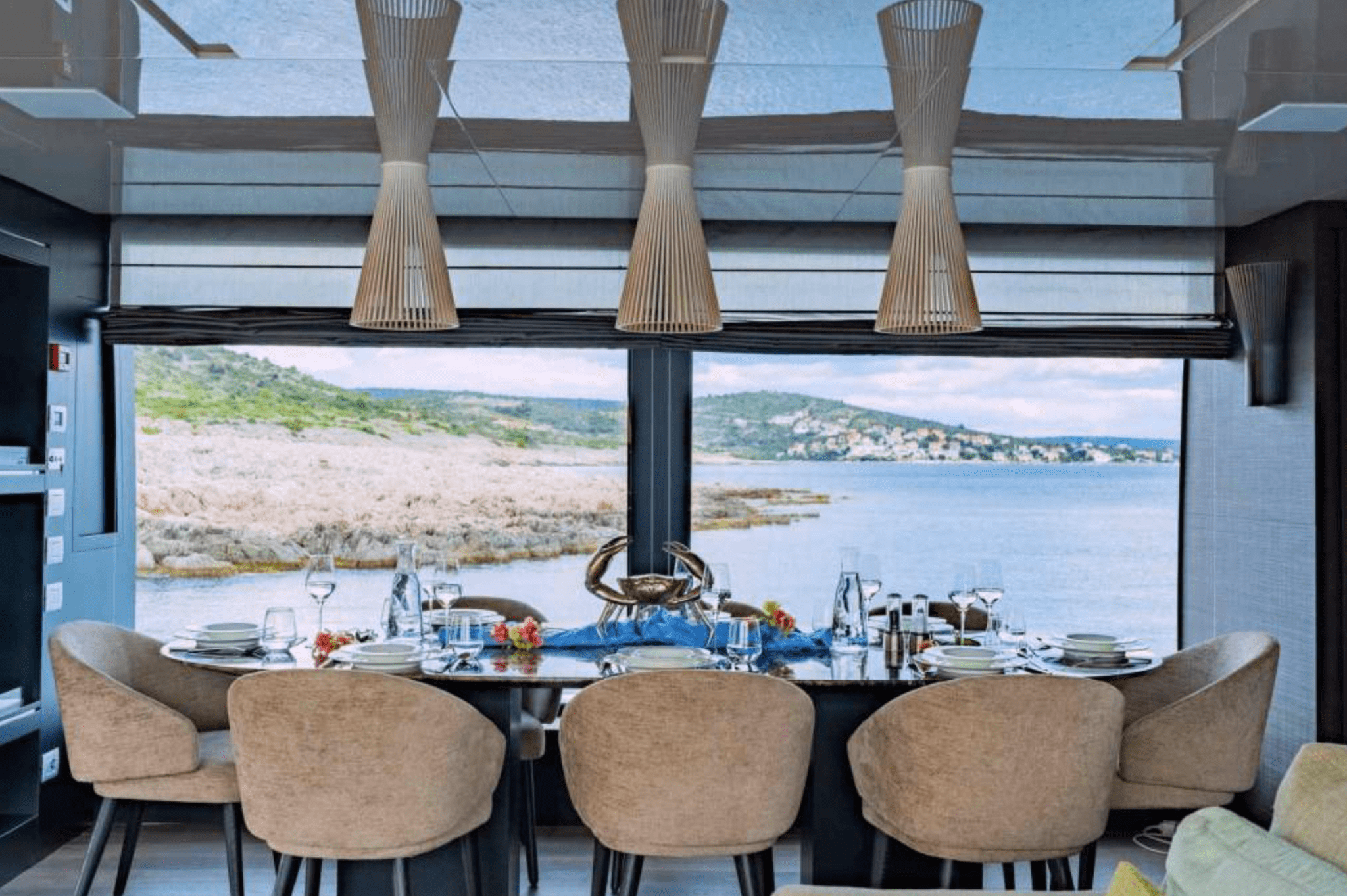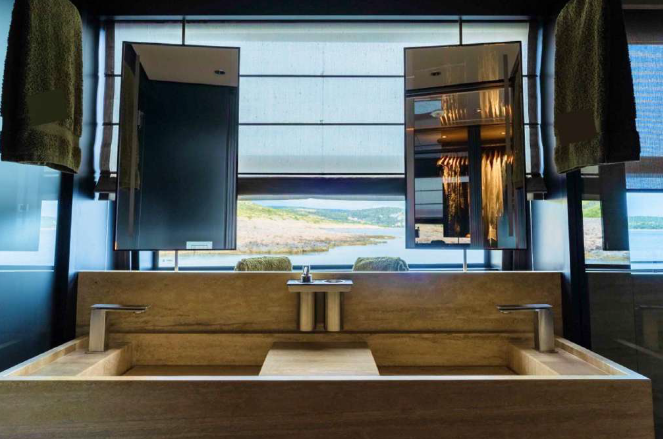 The master cabin is positioned forward and accessible via a side door on the single side deck, ensuring maximum privacy. Enjoy top speeds of around 28-29 knots and a cruising speed of 25 knots with the twin 16V MTU engines.