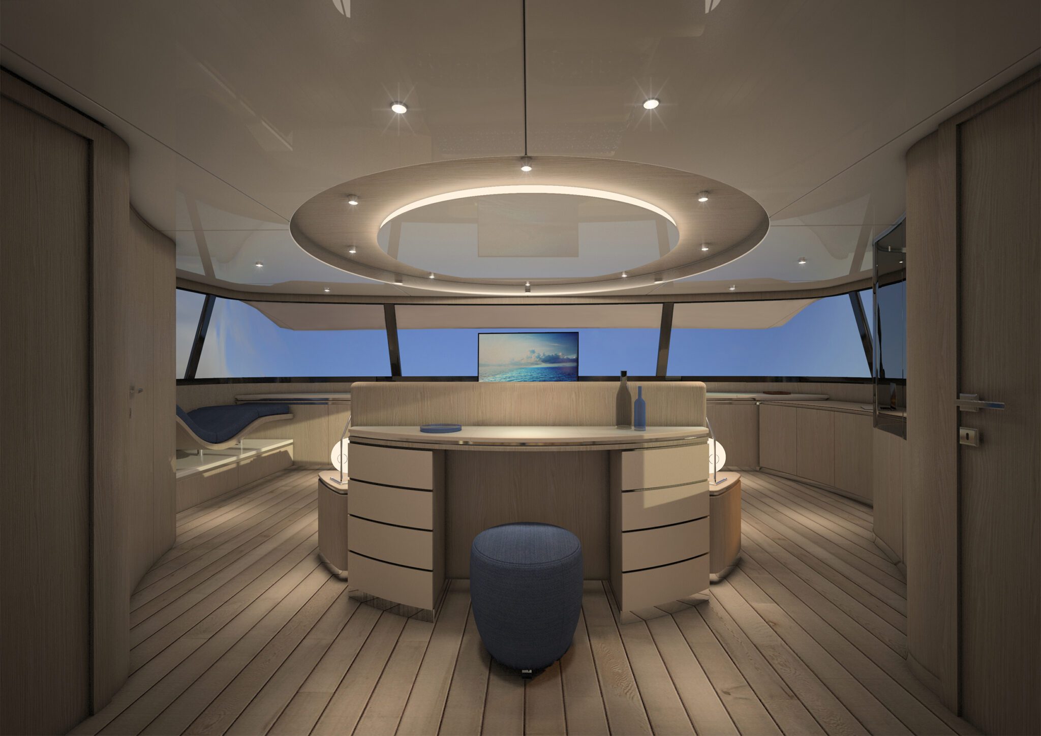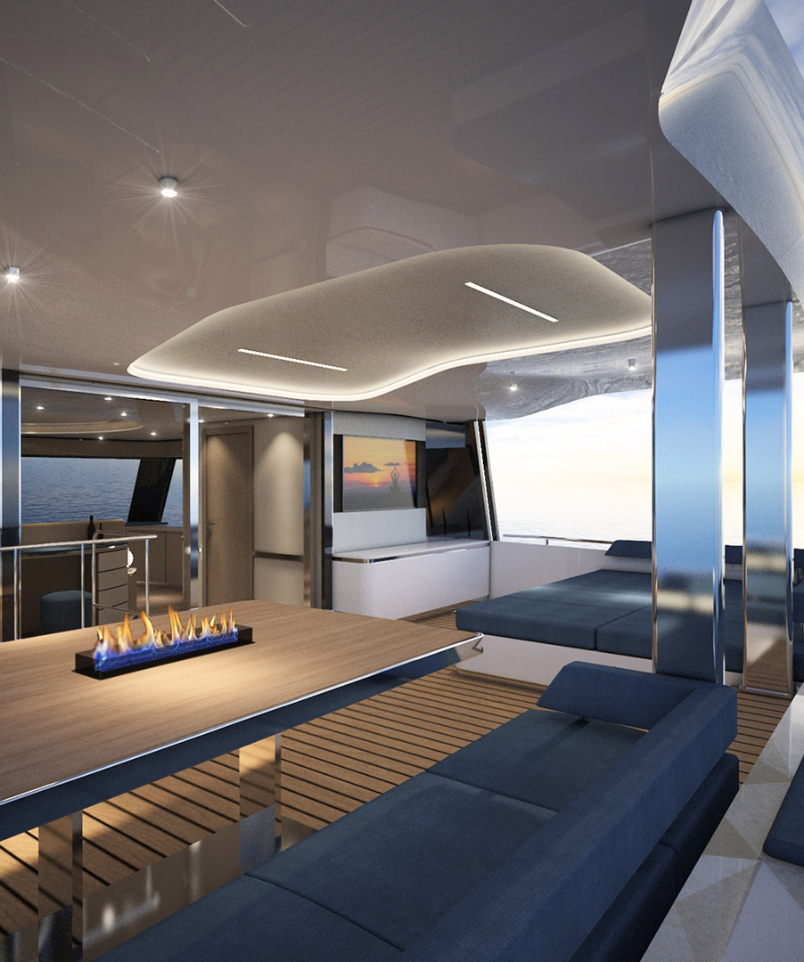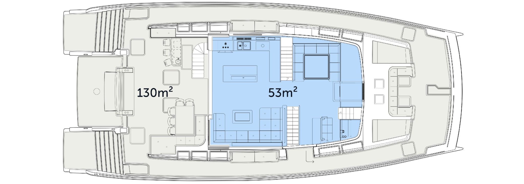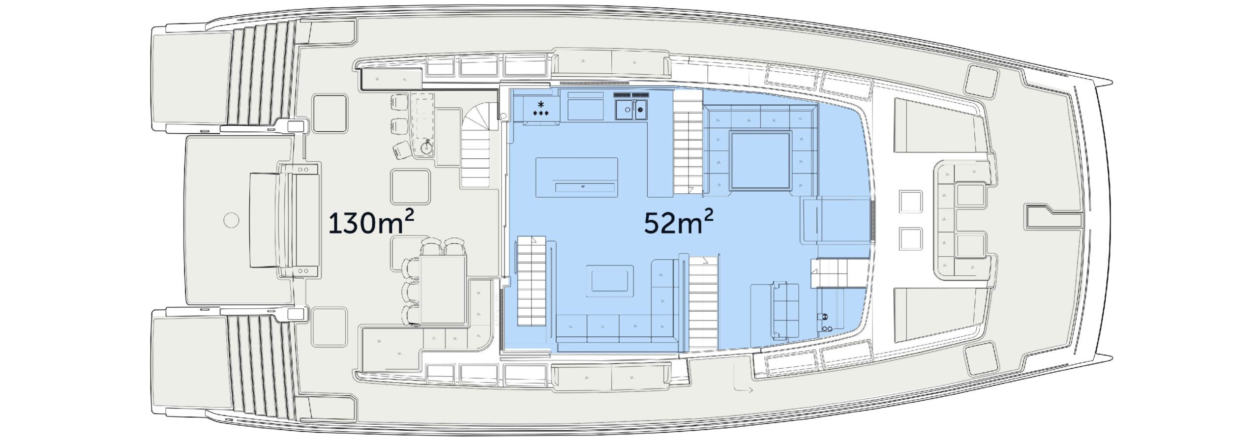 The closed 3-deck version features an owner’s suite with a private 41 m² aft terrace. Those who value sharing their experiences on board can opt for an indoor lounge instead. It is comprised of a 39 m² dining area, fully equipped with a bar and galley, while still maintaining the same terrace in the aft.