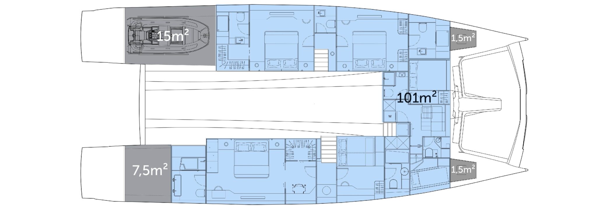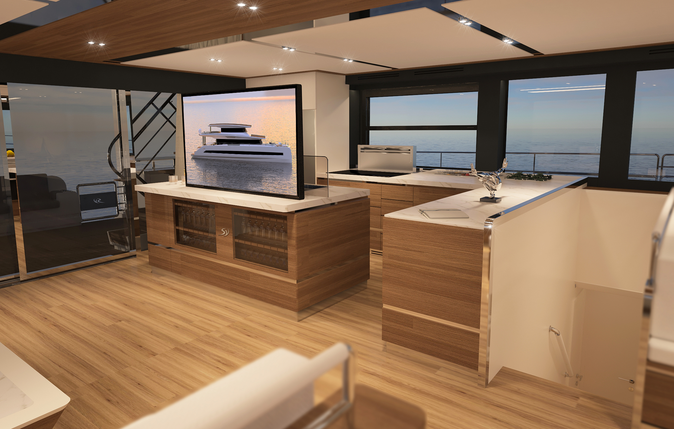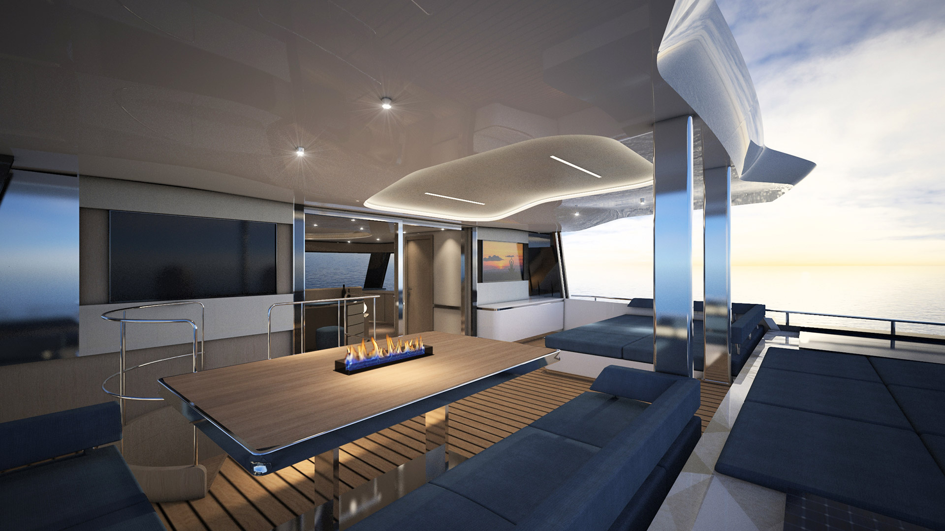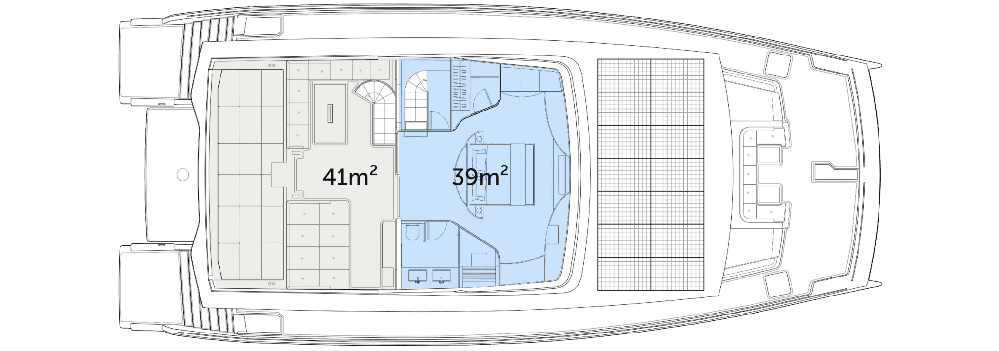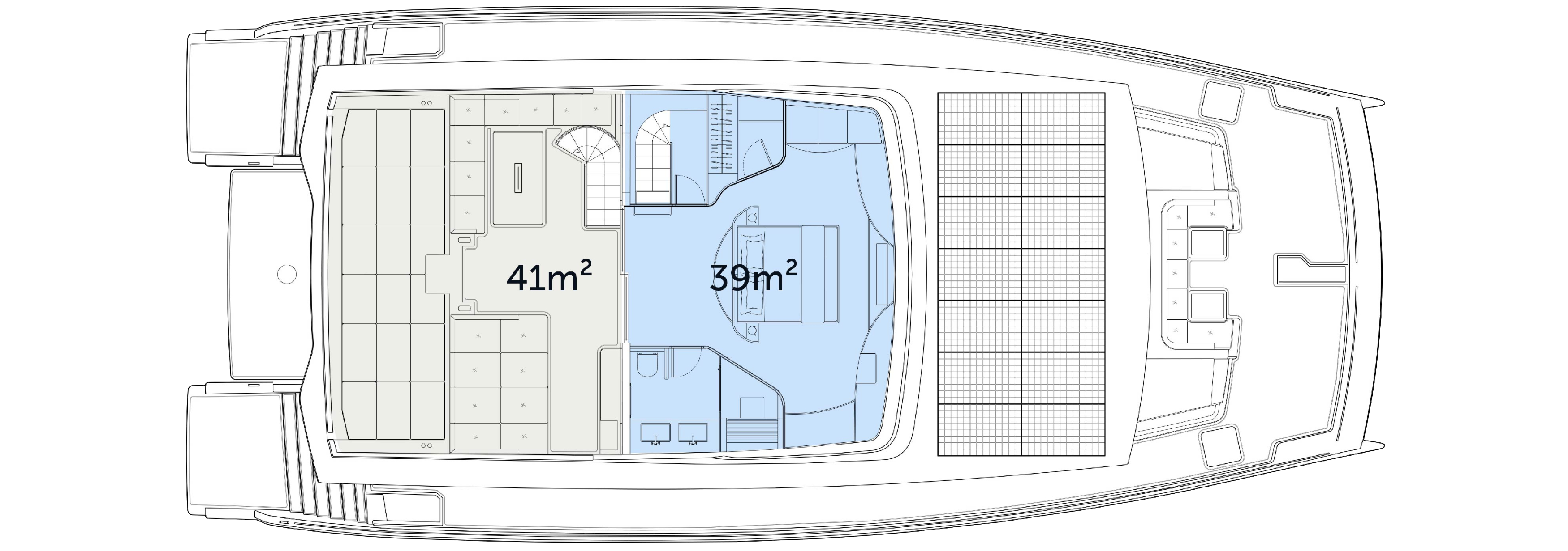 The closed 3-deck version features an owner’s suite with a private 41 m² aft terrace. Those who value sharing their experiences on board can opt for an indoor lounge instead. It is comprised of a 39 m² dining area, fully equipped with a bar and galley, while still maintaining the same terrace in the aft.
