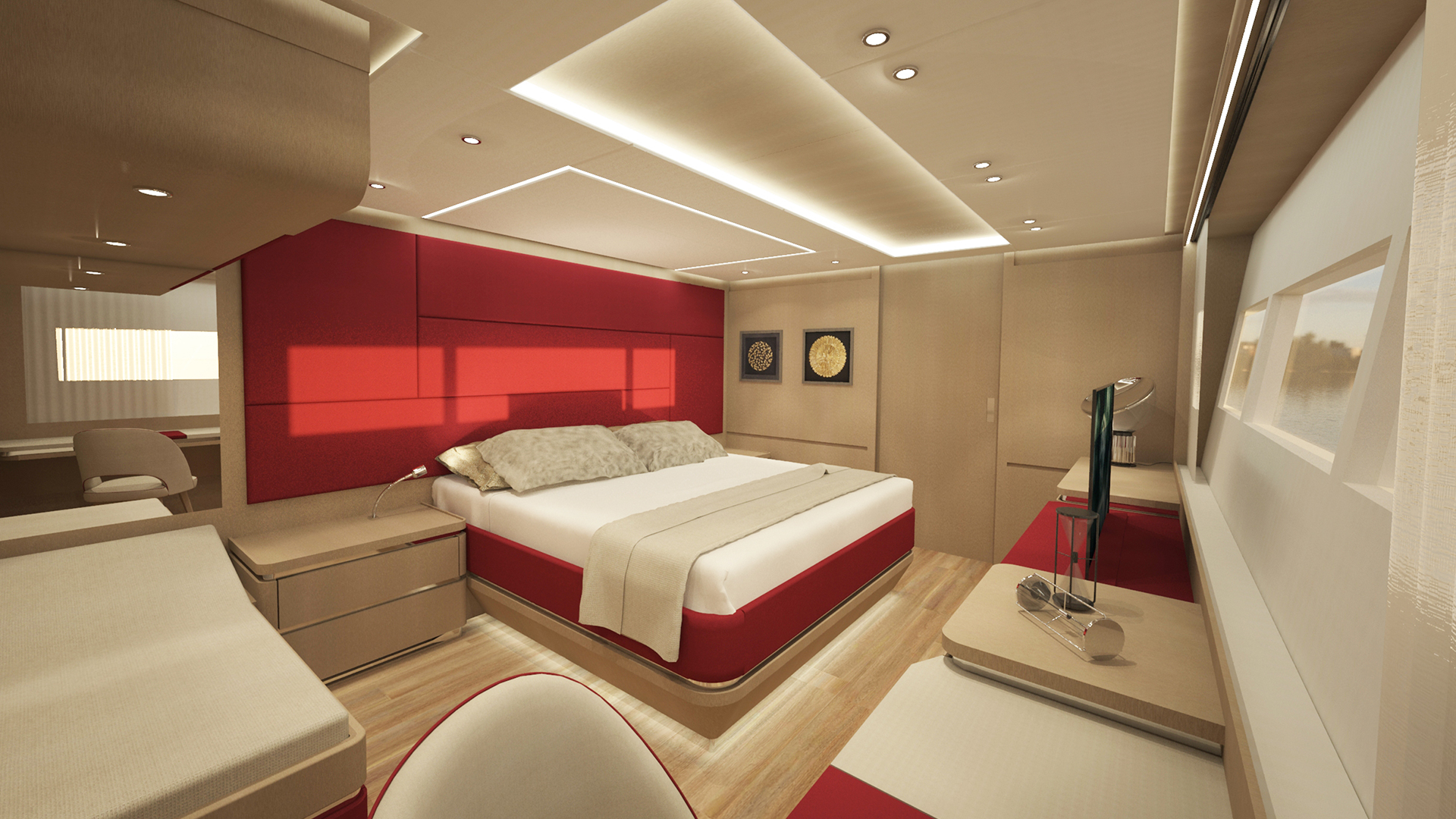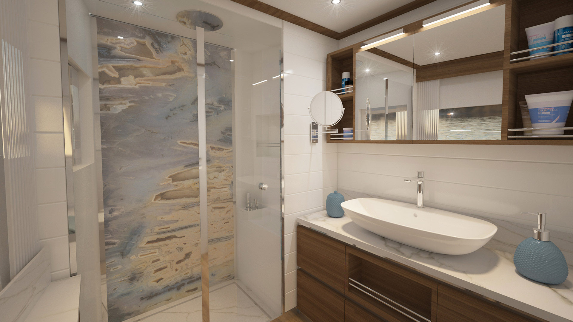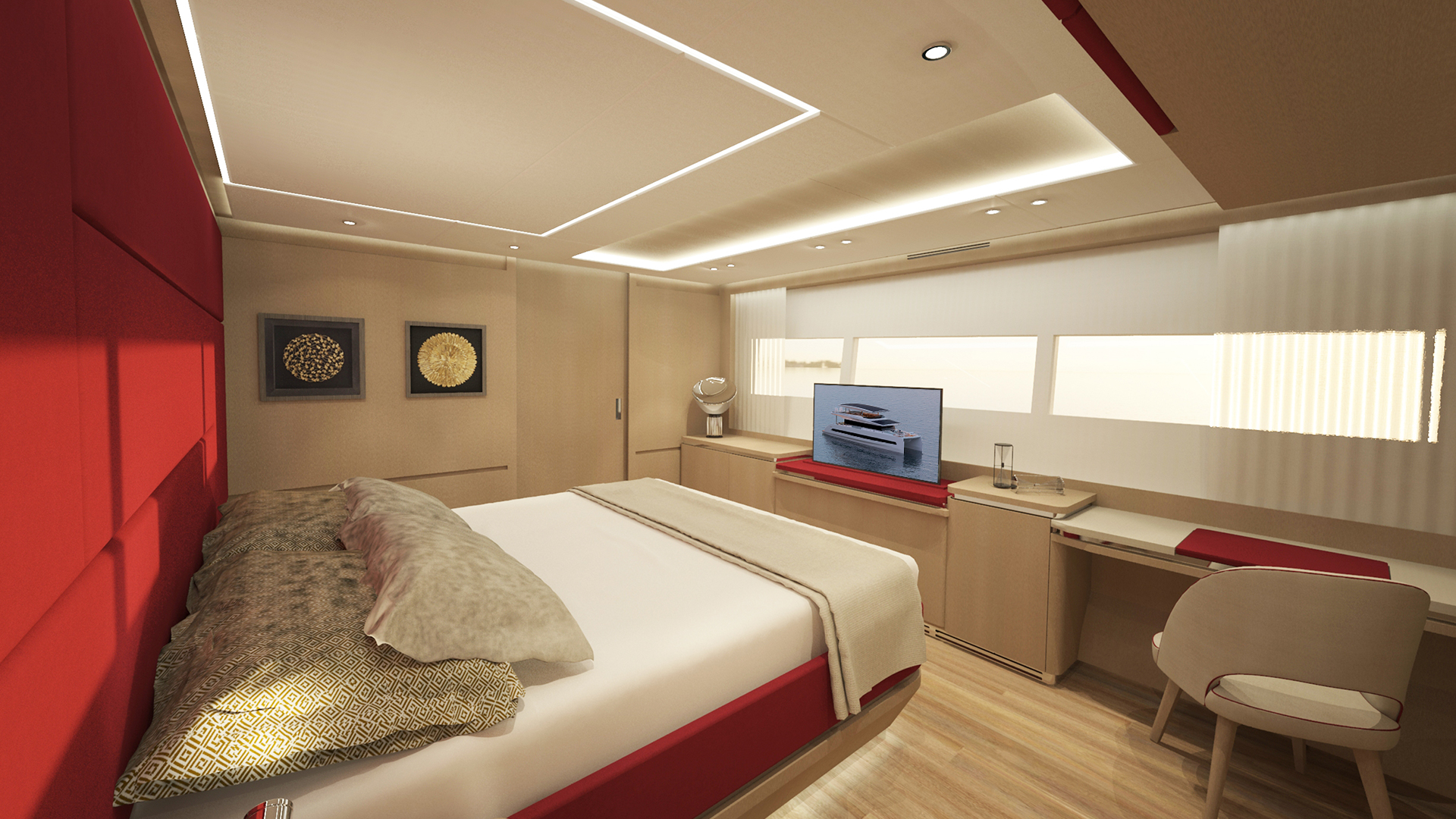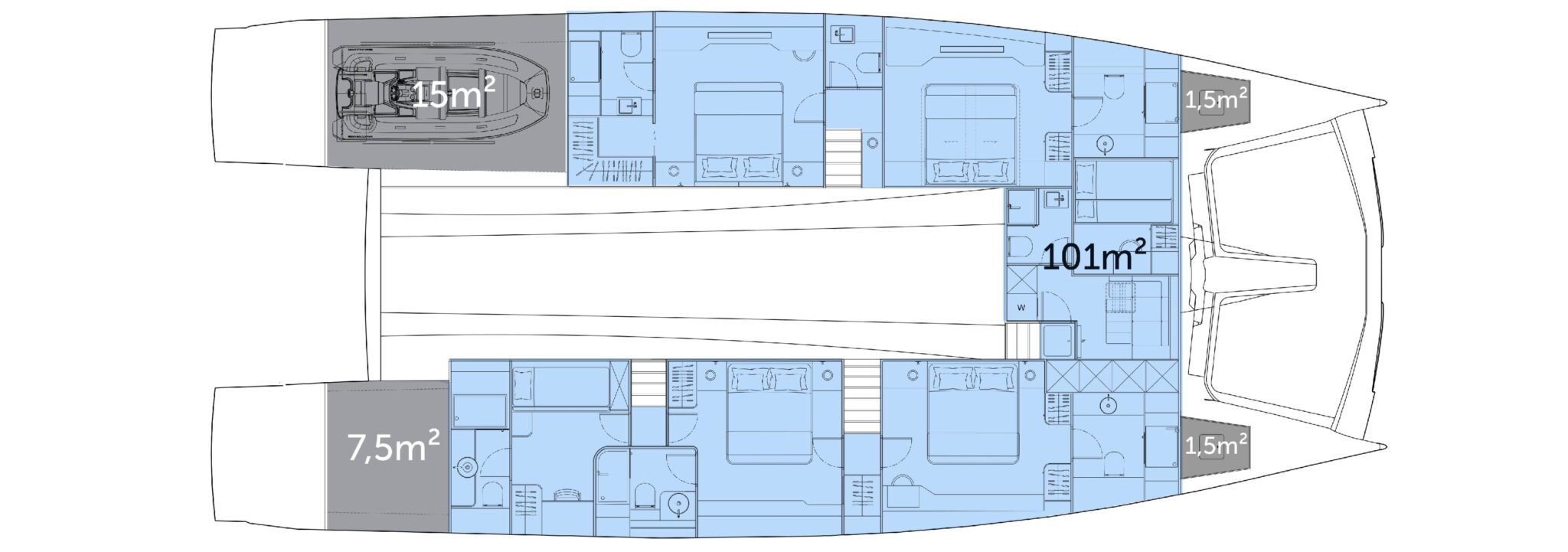 The closed 3-deck version features an owner’s suite with a private 41 m² aft terrace. Those who value sharing their experiences on board can opt for an indoor lounge instead. It is comprised of a 39 m² dining area, fully equipped with a bar and galley, while still maintaining the same terrace in the aft.